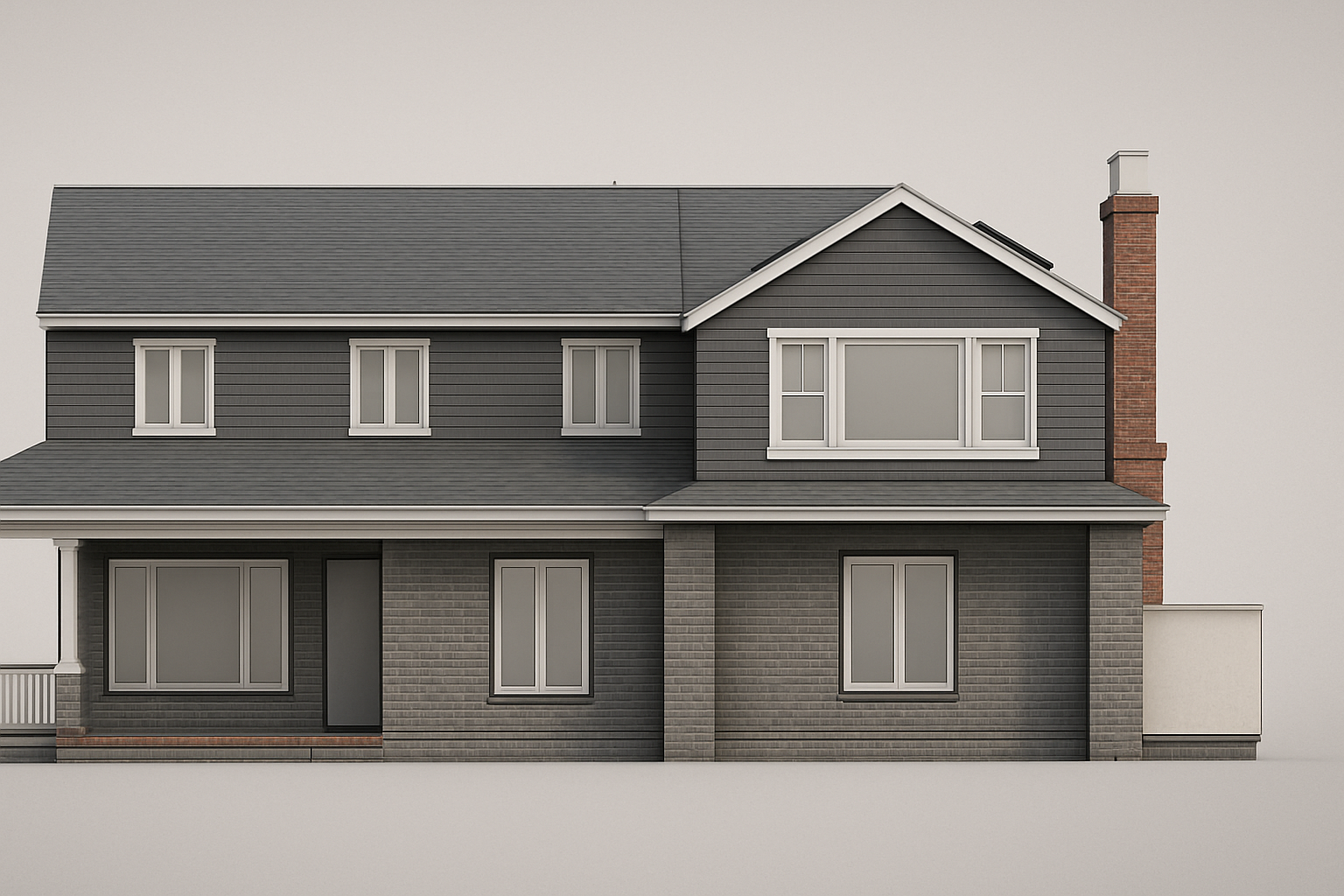gothic exterior shot add bargeboard vergeboard to gables cream brick on lower level horizontal cream siding on upper level light wood front door light wood shutters on windows architecture