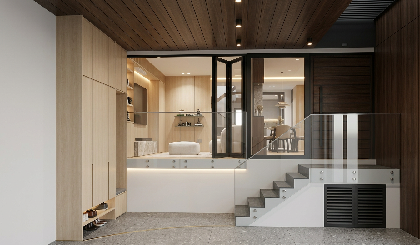 a modern architectural building with a sleek rectangular design featuring vertical profiled corten paneling in warm rusty tones large glass windows are integrated throughout the structure reflecting the surrounding environment the setting includes scots pines with soft muted green hues for a contemporary look there are low scots pines avenue in the background behind the building lush green short grass on the island between the asphalt the atmosphere is serene and slightly overcast with subtle diffused lighting casting gentle shadows the street is paved with smooth gray asphalt complementing light white gray decorative gravel that border the road and concrete board between them people are walking near the building the scene conveys a harmonious blend of nature and urban design