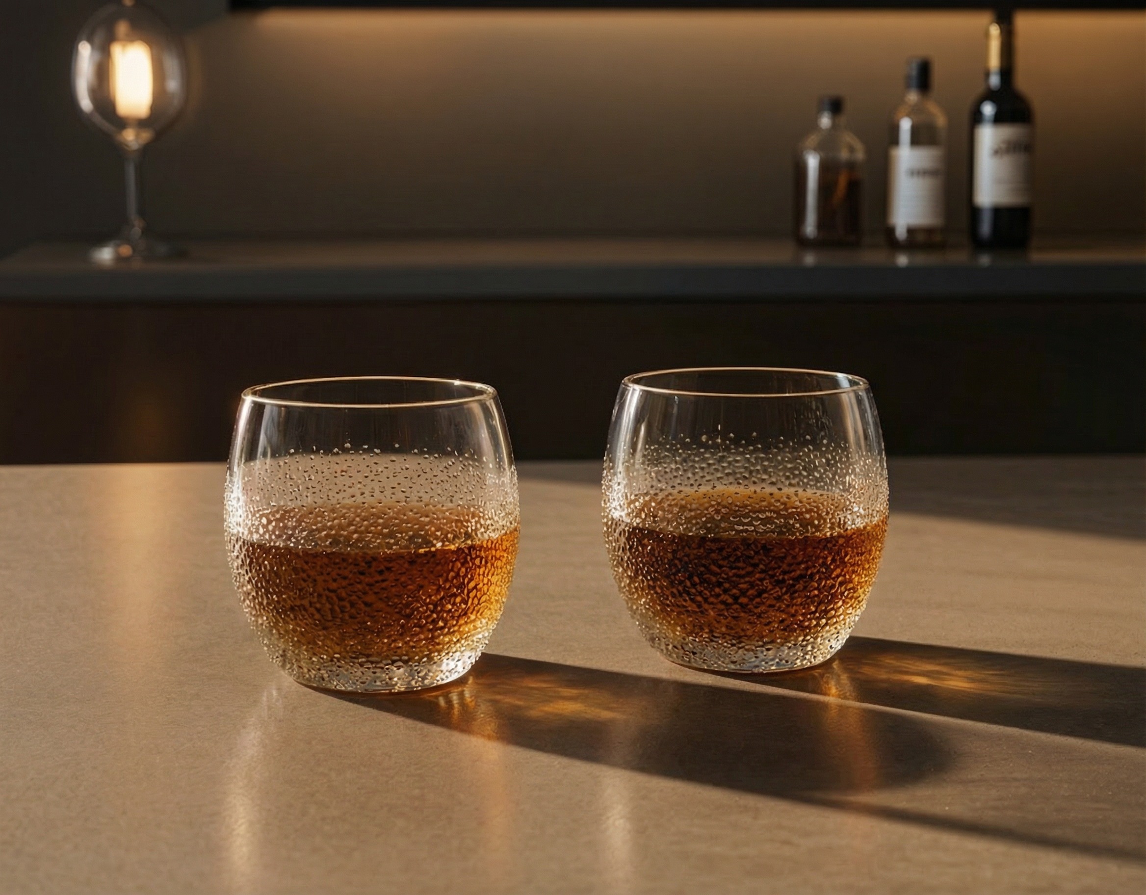 close up shot transform the glasses in the image into a refined product render while preserving the original composition lighting and environment main modification replace the smooth external surface of the glasses with a micro textured glass surface identical to the reference image the texture must consist of small rounded raised bumps micro domes denser in the lower part and gradually fading towards the upper edge important the texture must be subtle and tactile not exaggerated it must remain almost invisible at a distance but clearly visible in highlights and reflections do not alter the shape proportions or thickness of the glasses material transparent glass with realistic thickness preserve the liquid inside warm amber tone maintain correct refraction and distortion through the textured surface lighting keep the same warm directional lighting ensure the texture interacts naturally with light soft highlights on bumps preserve shadows and reflections on the table environment do not change the background or scene keep the bar setting and atmosphere intact rendering style photorealistic high end product visualization realistic glass shader accurate reflections and refractions avoid no smoothing of the texture no geometric changes no added patterns no logos or text architecture