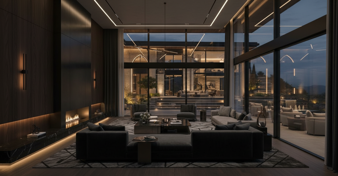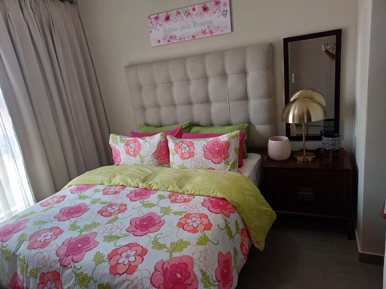 interior shot please keep layout as is and material surfaces make artwork big above the headboard