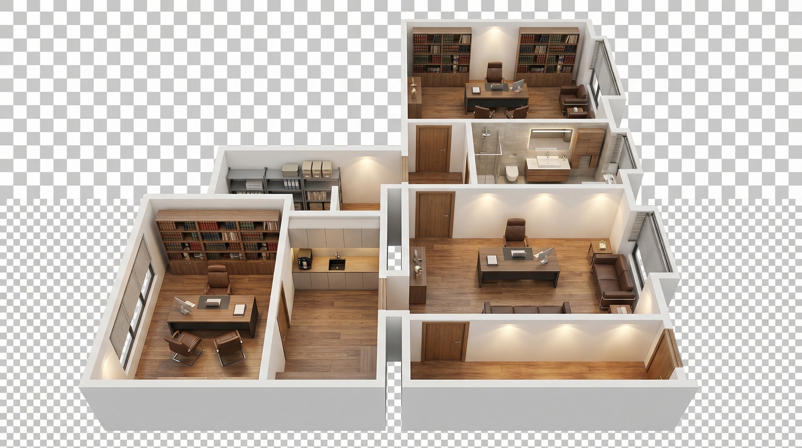 convert this floor plan into a realistic isometric 3d view of a full house show the space from an elevated angle with furniture walls and details visible create a beautifully rendered digital floor plan of an office layout use warm inviting colors with light beige for the office walls and soft gray for the hall floors the storeroom should have a muted green color and the kitchen should be highlighted with a subtle calming blue add rich deep brown for the doors and window frames illuminate the plan with gentle ambient lighting to create an atmosphere of comfort and professionalism incorporate subtle shadows for depth and realism use the same furniture as shows on the plan do not change the orientation of the floorplan