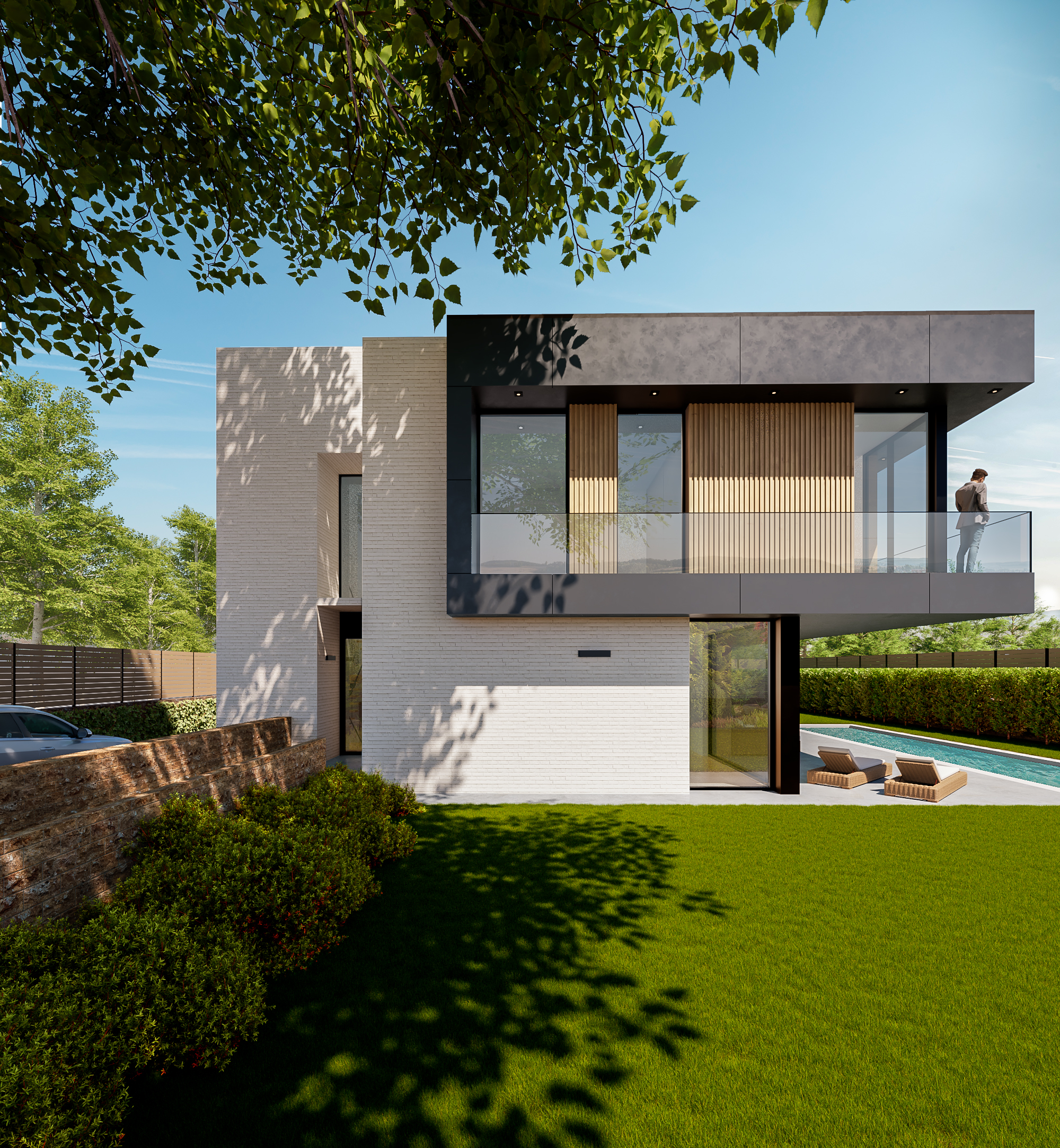 install a linear led on the ceiling of the first floor balcony and illuminate the plot a bit with low lights or beacons as well as the pool make the house look a little better from the outside