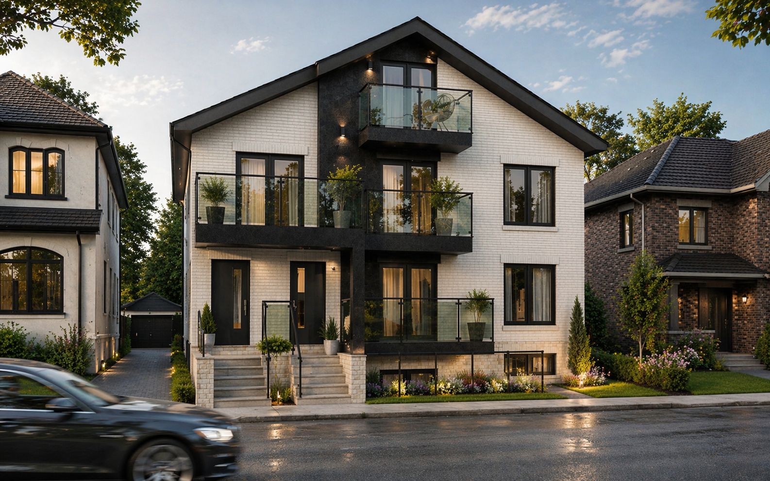 create a photo realistic image soft afternoon evening light maintain the material of the off white brick and black metal paneling