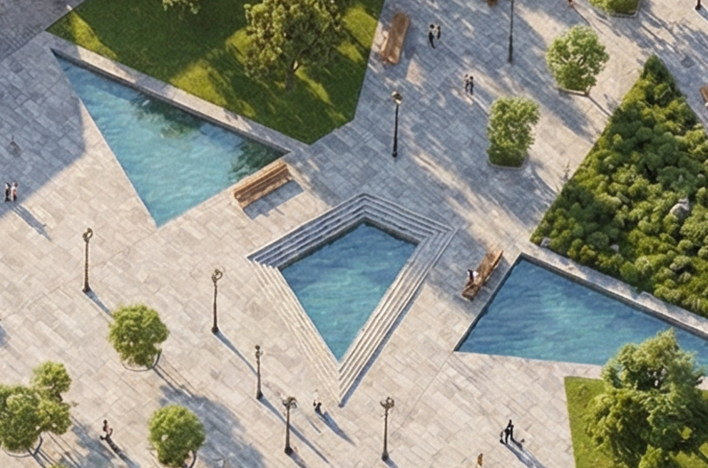 fai una vista render all altezza di un uomo che guarda circa 1 8 m questa piazza d acqua a gradoni che scende di 1 5 metri dal livello della piazza mantieni l assetto della pianta di riferimento e mantieni l arredo urbano e gli alberi inseriti
