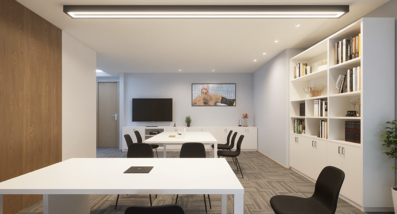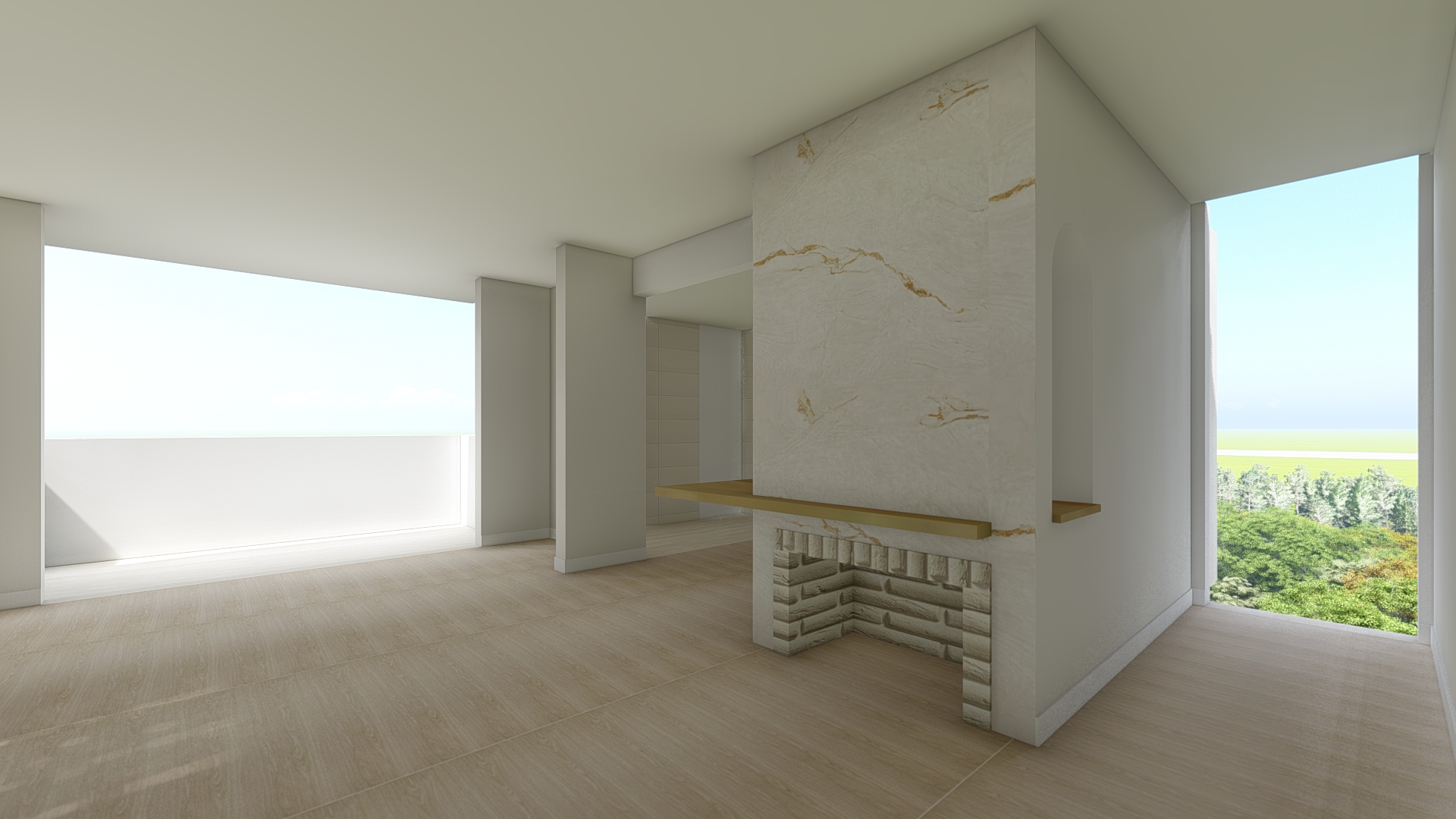 hyper realistic rendering of a minimalist empty interior preserving exactly the original volumetry warm toned natural wood flooring walls clad in white marble with fine irregular golden veins left wall featuring regular grid of square marble panels lowered concrete ceiling with subtle texture and central marble fireplace structure with solid wood top shelf and lower niche detailed in stone