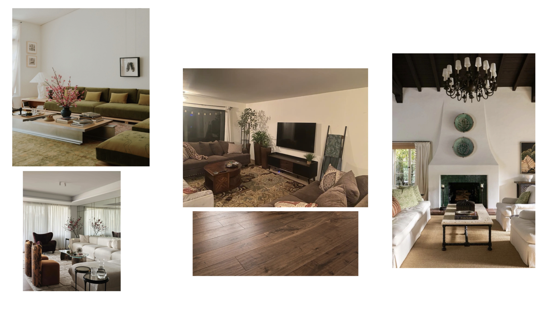 use the middle image as a reference for actual space the image on the lower center is the flooring use the srounding images as inspiration for the center image redesign