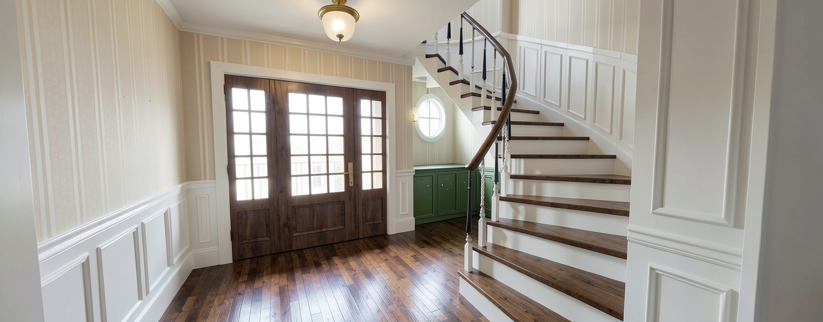 respects the geometry of the elevation white wooden window with lighting under the cabinets