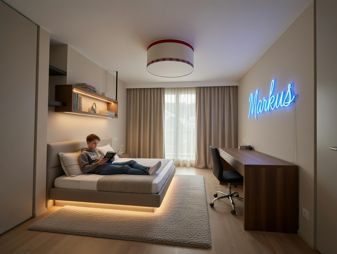 genau dieses rendering berarbeiten fotorealistisches innenraum foto exakt dieselbe perspektive und kameraposition wie das hochgeladene referenzbild 100 identische raumgeometrie vollfl chige horizontale jalousien ausserhalb der fenster linke seite dunkelbraungraue wand und schrank vorh nge kaffeebraun teppich anthrazitfarbig roter puffsitz ganz links raum zus tzlich k nstlich ausleuchten sanfte realistische schatten weiches nat rliches tageslicht mit schatten der jalousien an den w nden hochwertige oberfl chenreflexionen nat rliche farbwiedergabe golden hour feeling hell ausleuchten das bild muss wie eine professionelle fotografie aussehen es soll ein echtes und reales foto sein canon eos r5 35 mm festbrennweite f 2 8 hyperrealistisch dslr qualit t raw aufnahme 8k aufl sung extrem scharf perfekte tiefensch rfe professionelle architekturfotografie