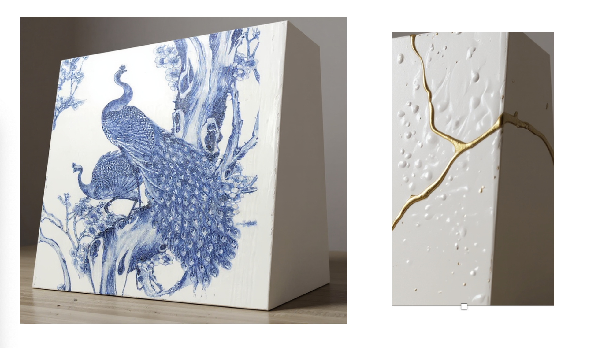 maintain all of the details and colors on the image on the left however add gold kintsugi to the top of it