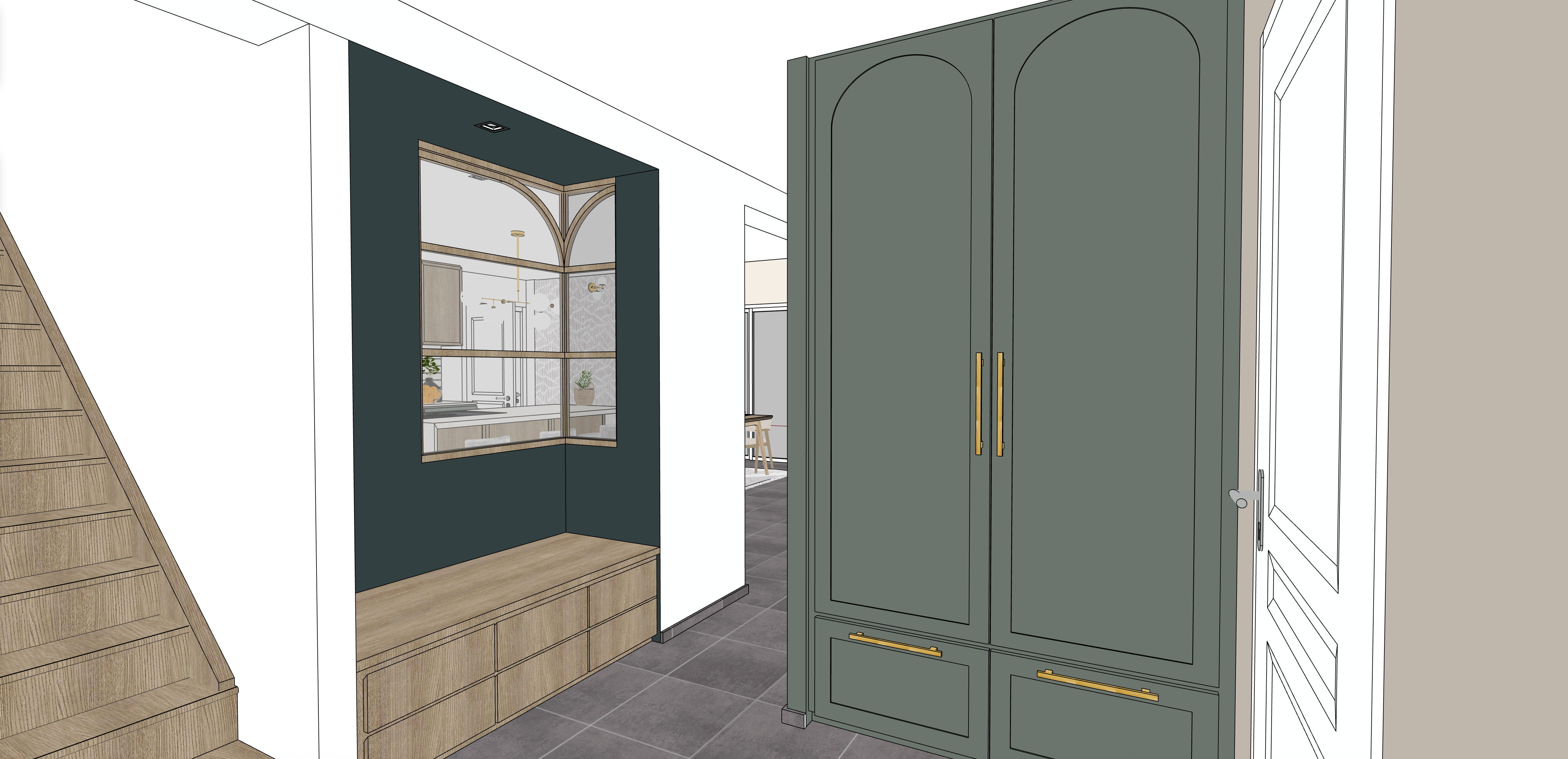 jour lumineux clairage naturel uniforme ombres douces spot allum escalier bois fr ne clair banc d entr e ch ne clair quincaillerie de penderie laiton verri re ch ne clair avec vitrage transparent