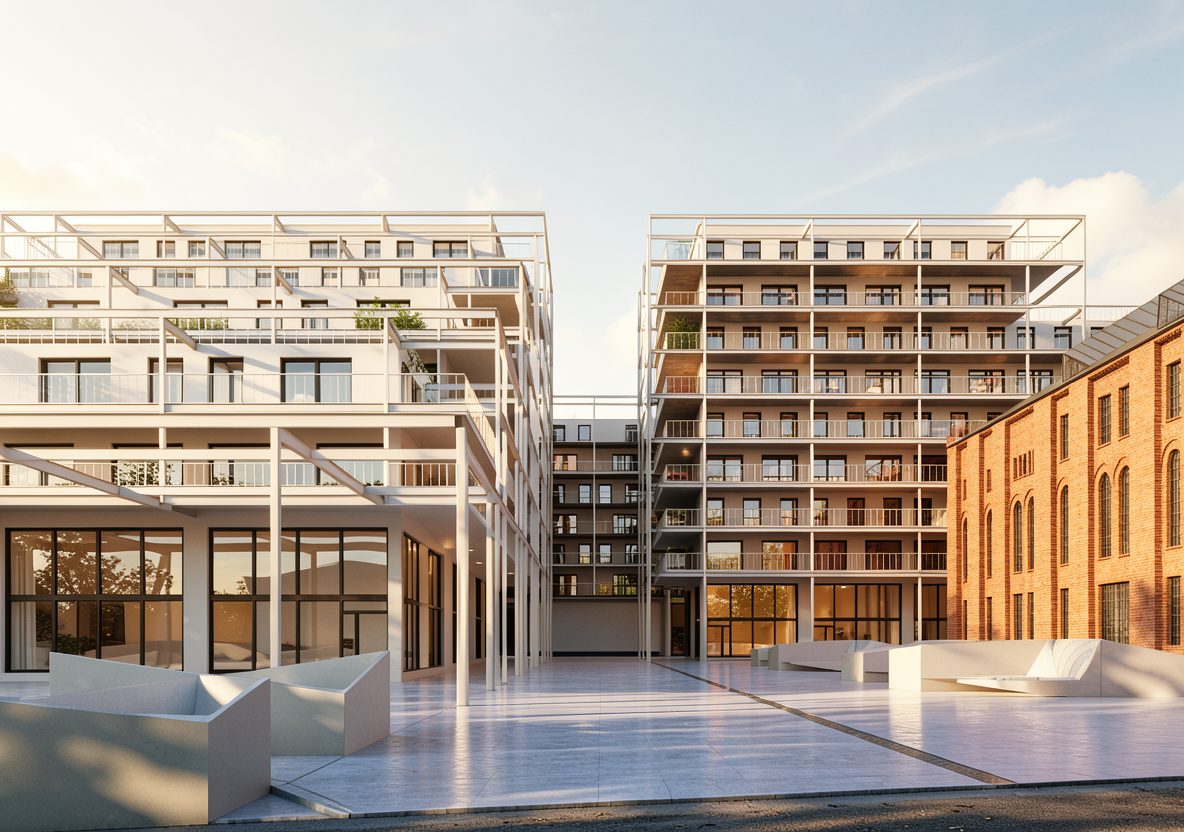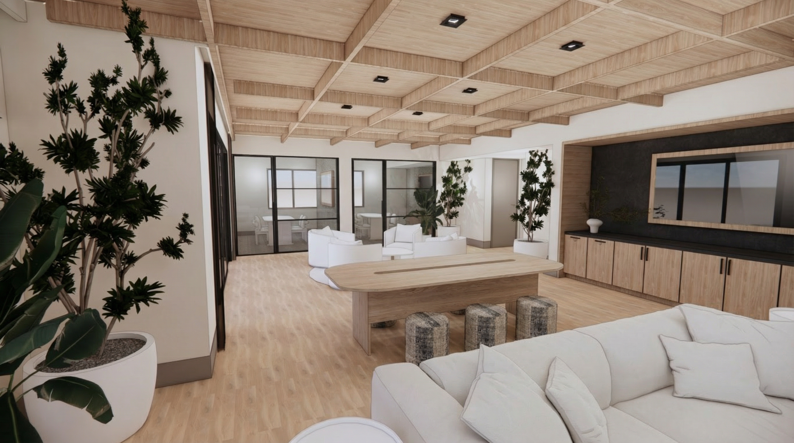 keep everything identical to the reference image do not change layout materials furniture lighting or camera angle only modify 4 chairs to be minimal design in taupe upholstery finish table to be a rift cut white oak finish 3 stools to be cylindrical shaped and fully upholstered in a taupe grey black and cream speckled fabric sofa to be a cream california minimalist sofa like restoration hardware and round area rug to have a blue to aqua color gradient that is sophisticated with a viscose look finish