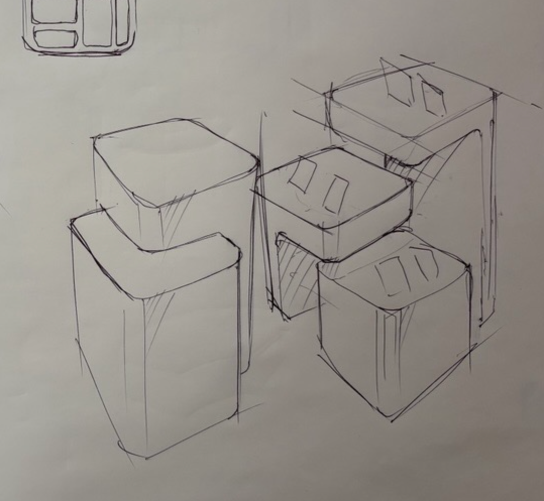 use this drawing to create plinths in a retail envornment that is a blank white and minimal the plinths should be made from natural light birch timber fluting with a white corian top include shadows and natural lighting display mobile devices and new tech on top like watches or tablets