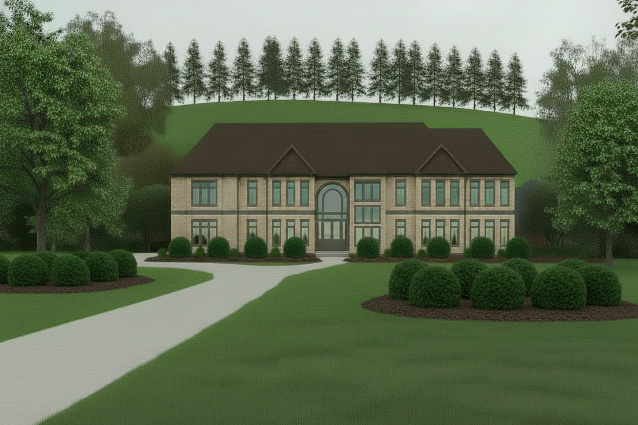 photoreal render of this exact facade and camera keep all geometry and material colors add realistic greenhouse vegetables visible through the second floor glass tomato and cucumber vines basil and leafy greens add light spillover plants ivy and creeping thyme draping 6 to 12 inches from every concrete parapet bright summer daylight no layout changes
