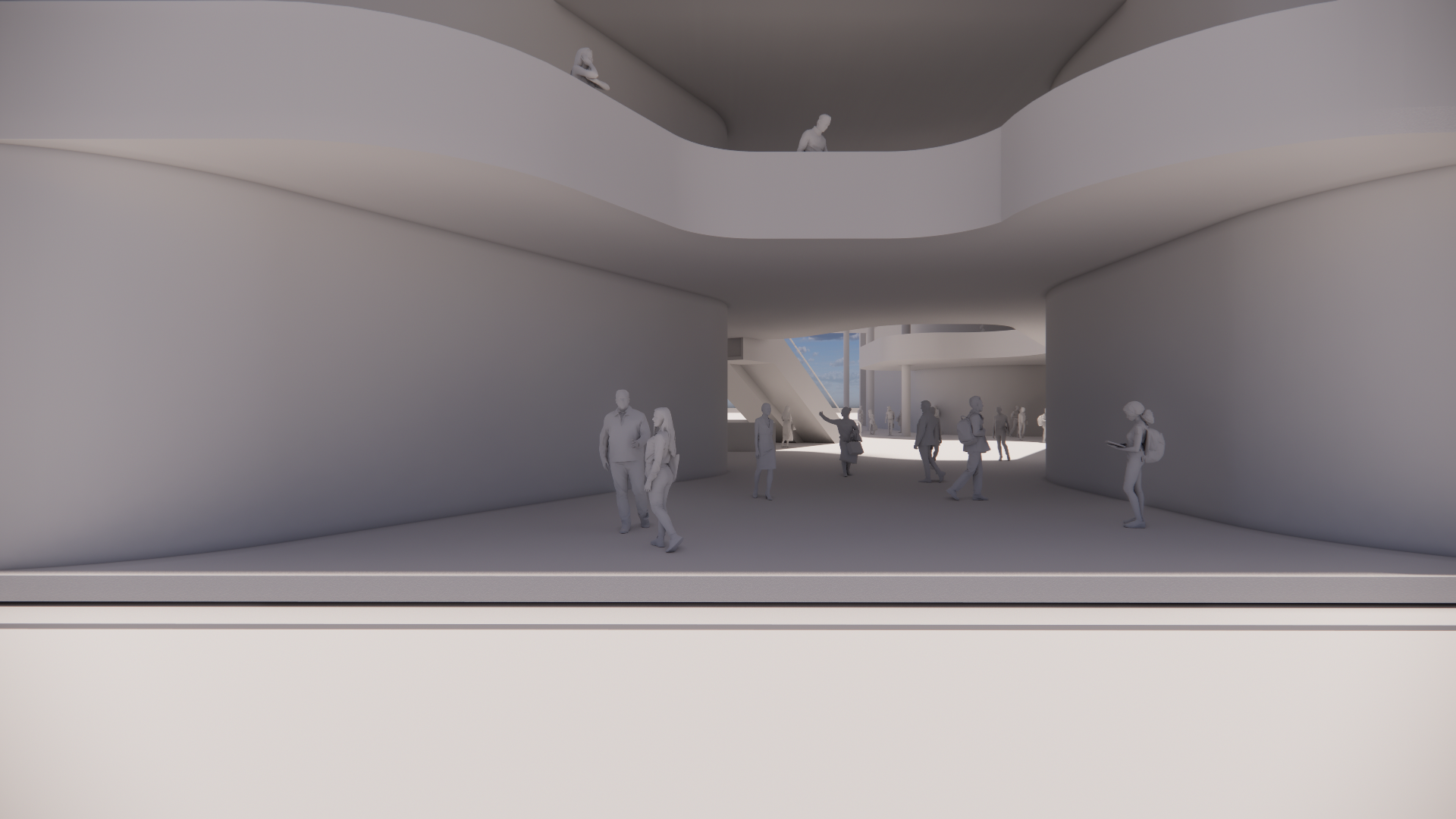 make the walls on the lower level galzed with a retail clothing upmarket shop on the left and the right hand side look like a lobby for a purpose built student housing foyer with cafe the ground surface should be a charcoal grey bush hammered stone high end plaza style paving there should be downlights in the soffit of the walkway over the upper floor ceiling should be using perforated plasterboard ceiling and the walls should also be retail high end shop fronts the wahite in the foreground is a bitumen roadway but should have ccobblestone paving and place some fixed furniture in the lower level plaza with planting and timber fixed seating around it add the people back in please and the right hand side is a student building with a cafe not a clothing shop the left hand side is correct also instead of the furniture and the planters being on the sides can you make them organic and place them slightly offset but more central so you can walk between the shopfronts and the furniture