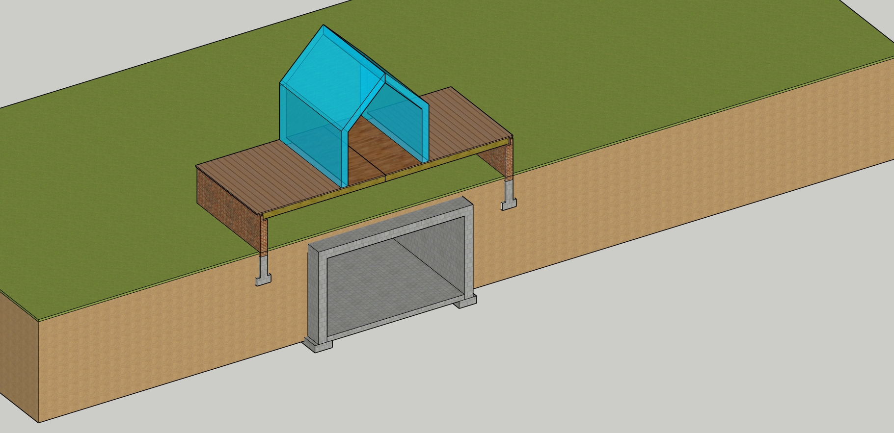 create a photorealistic building diagram of a glass house on a floor slab transferring over an underground tunnel