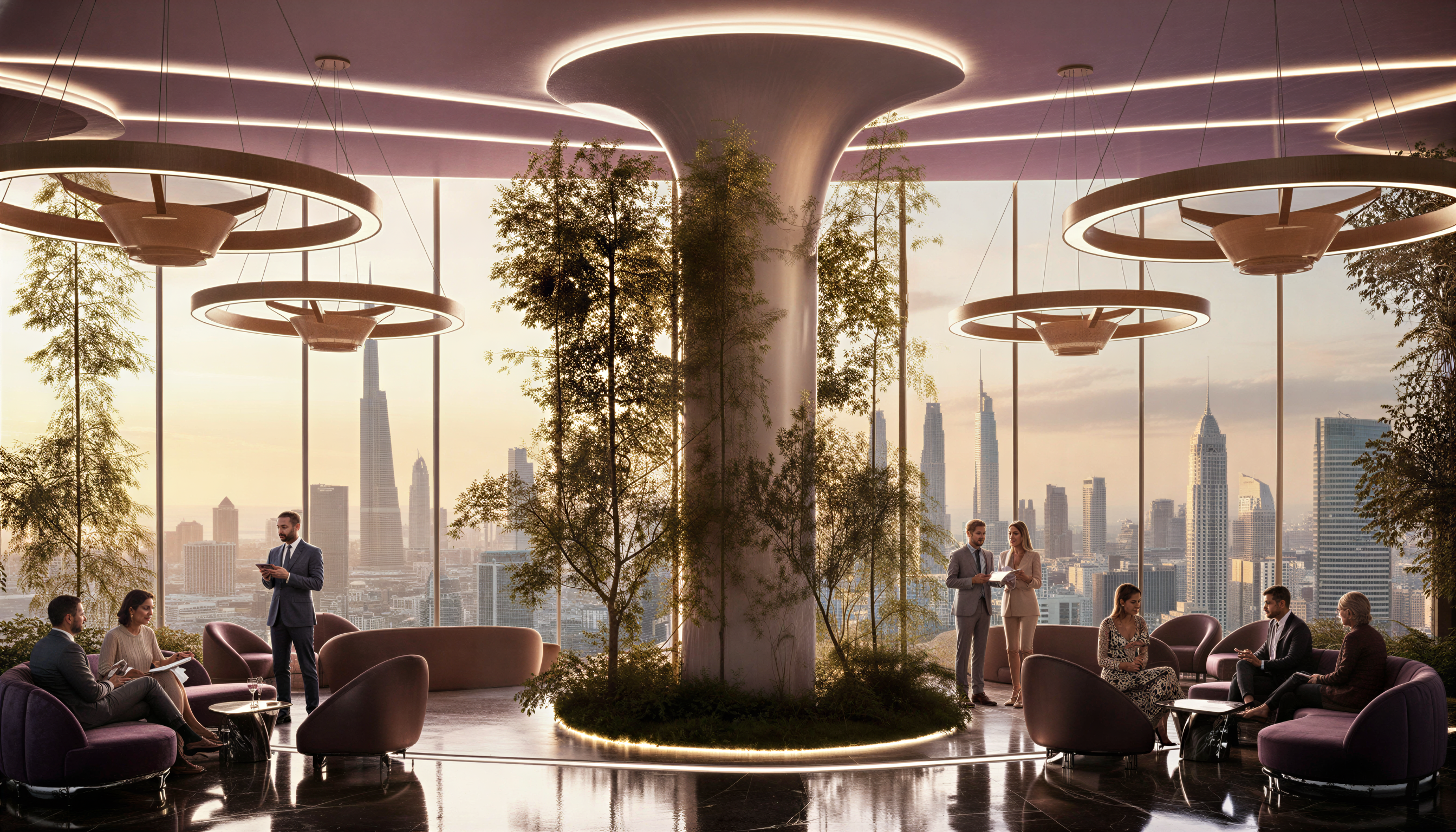 luxurious futuristic sky lounge belonging to an elite arts club hanging fabric lights
