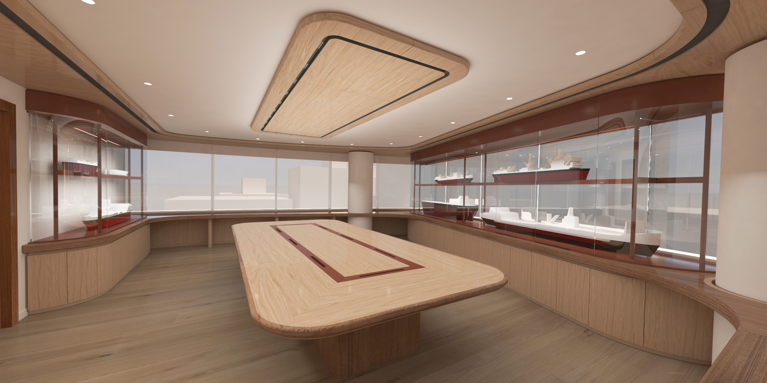 add multiple ultra realistic oil tanker ships in the background with accurate industrial detailing weathered steel hulls subtle rust streaks deck piping cranes safety railings realistic scale and proportions ships should feel natural in the environment with proper reflections depth and atmospheric perspective change the black ceiling stripe to ral 3005 wine red with a matte finish replace all existing reddish textures in the scene with ral 3005 wine red while preserving material realism keep correct surface properties such as wood grain fabric weave metal sheen or plaster texture only adjust the color not the material type ensure physically accurate lighting interaction with the new color realistic shadows bounce light and subtle color bleeding maintain high photorealism correct scale balanced contrast and natural global illumination