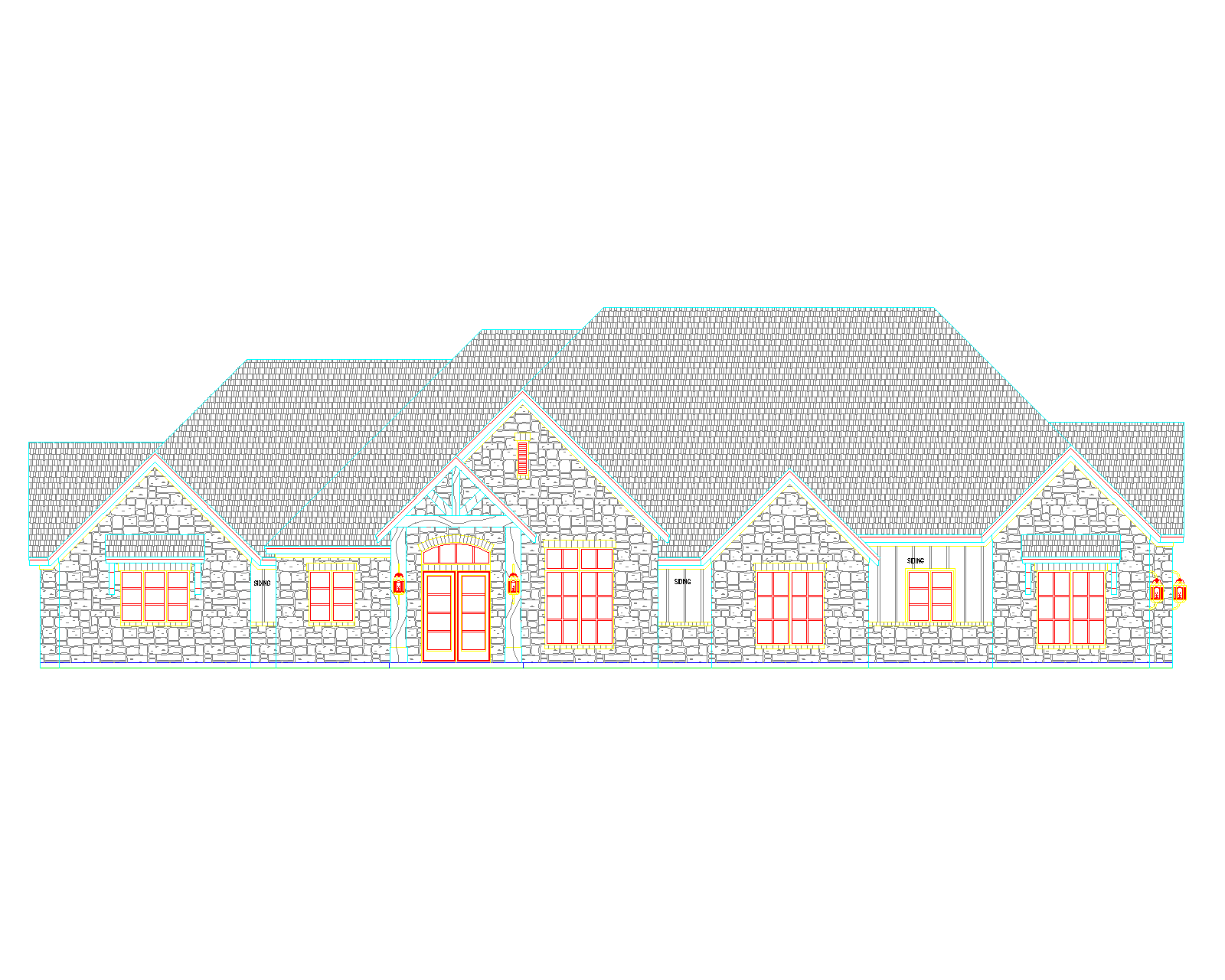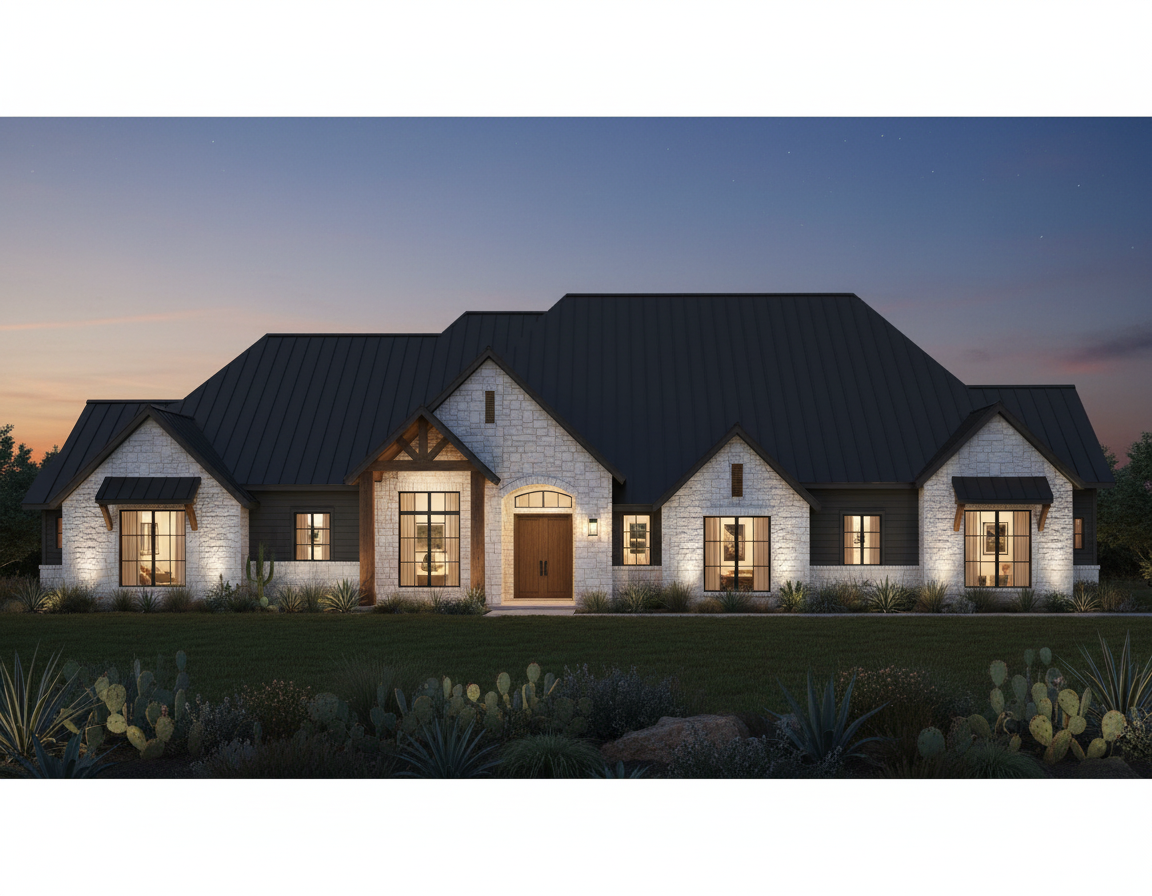 keep front porch integrity with timber porch in front of original front door create a precise representation of the existing architecture maintaining all original details and dimensions maintain the original image without altering any architectural details preserve the exact architecture and proportions of the provided drawing do not modify the rooflines windows doors or structural geometry maintain the original design exactly as drawn this is a material study only not a redesign show the entire house fully visible in the frame without cropping any part of the building 4 example material prompt modern texas hill country apply realistic exterior materials such as white texas limestone black standing seam metal roof steel framed windows natural wood accents dark grey board on board siding and warm architectural lighting photorealistic dusk rendering with native north texas landscaping with live oak trees