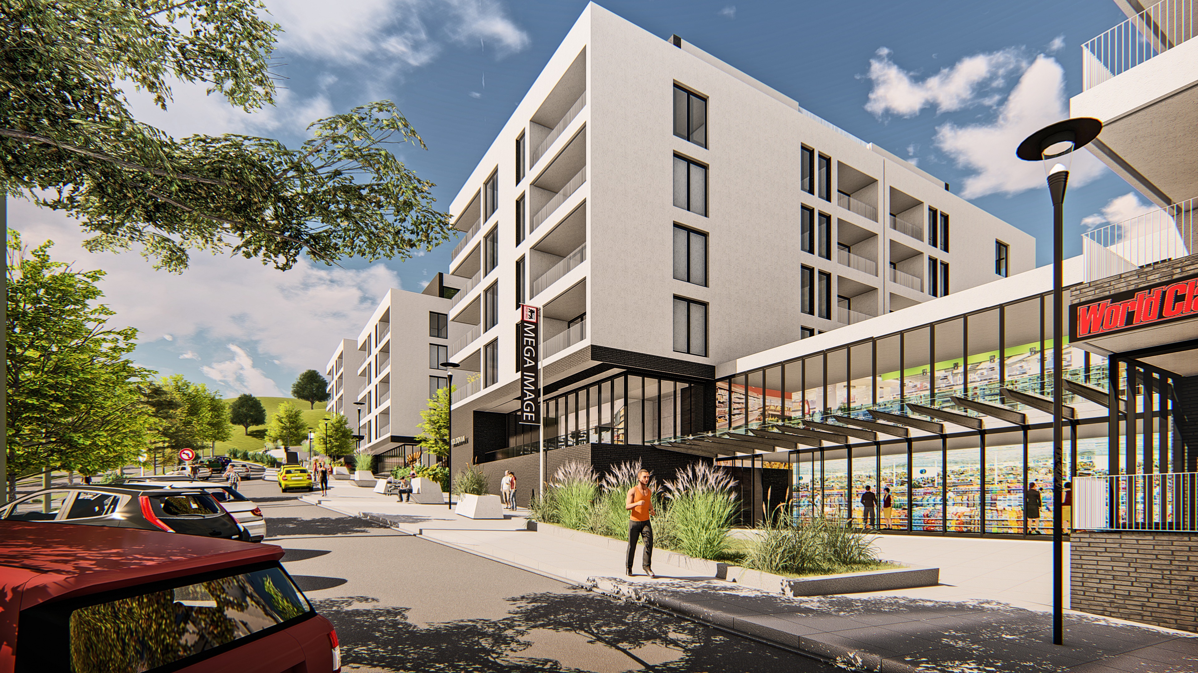 important preserve the existing geometry and the existing context exactly as provided do not modify alter reinterpret add remove scale or reshape any geometry do not change the site surroundings street layout neighboring buildings vegetation or context elements do not modify geometry scale proportions buildings road layout sidewalks or surrounding context in any way do not change text photorealistic architectural rendering clean and balanced contrast calm cinematic mood style contemporary european residential architecture minimalist premium understated include people subtle motion blur for realism do not add new people do not change the green space do not change the sidewalk do not change the road add reflection of the sorroundings to the windows remove the people dry asphalt