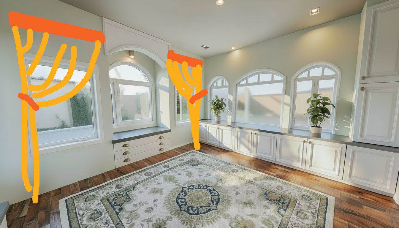 make these curtains look very realistic they should have a brown valence with tan curtains and a brown tie back