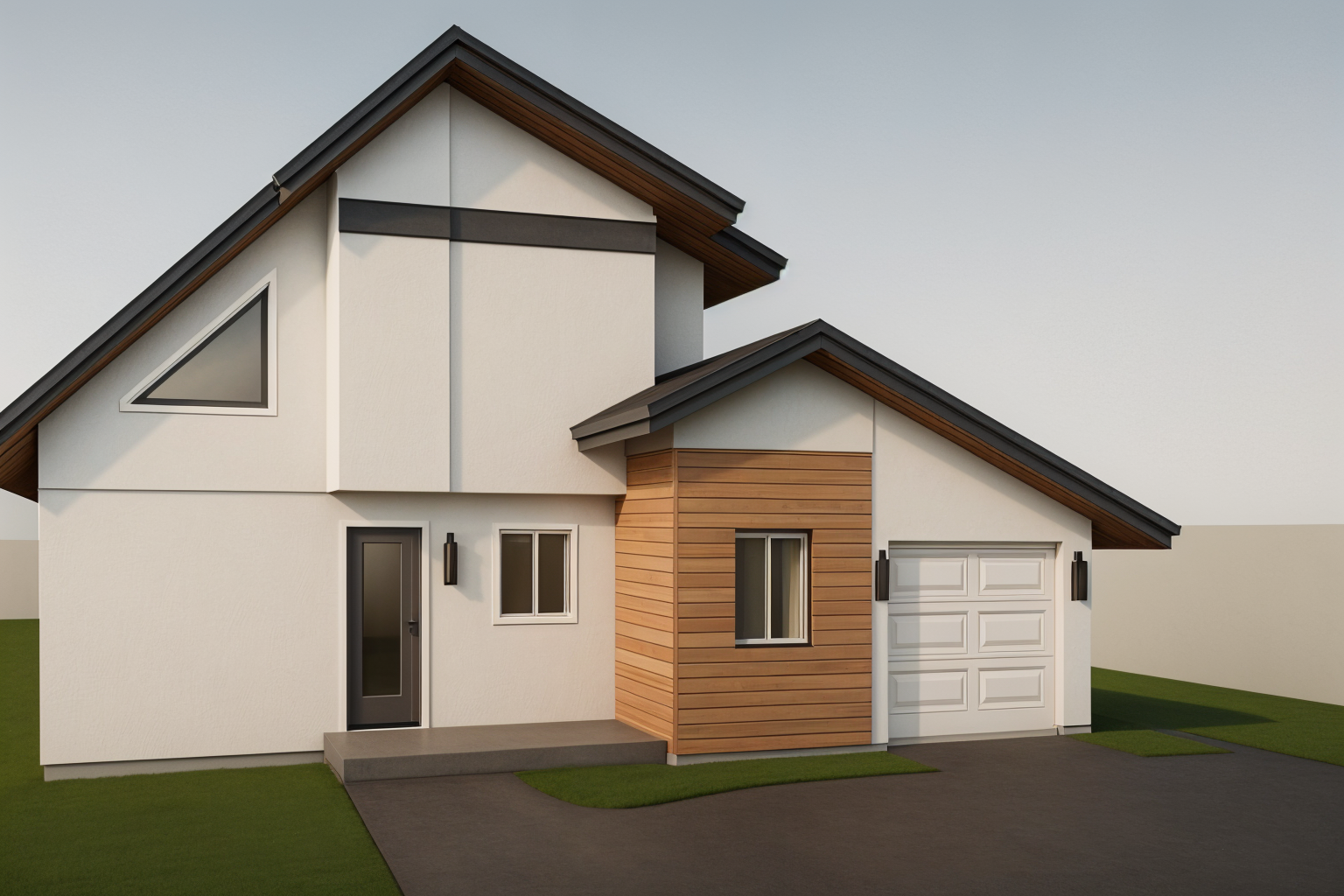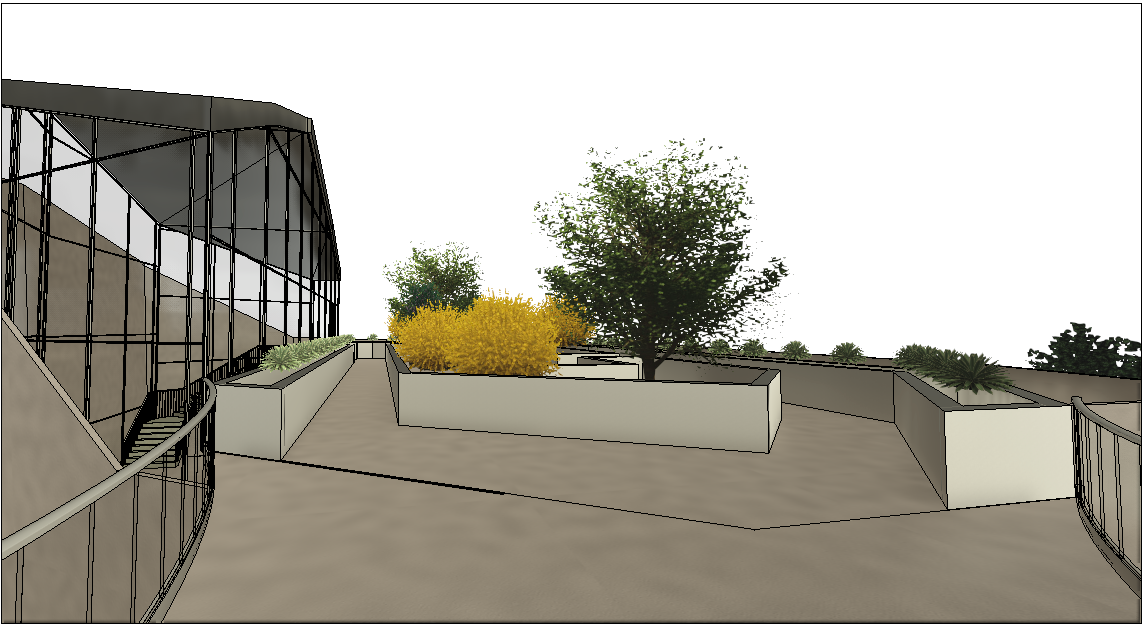 a beautifully rendered architectural elevation of a contemporary building with moss covered concrete walls blending into its natural surroundings the fa ade is softened by lush greenery and climbing vegetation with large glazed openings that reflect the landscape the setting is serene with dense trees ferns and soft groundcover framing the structure the composition highlights the harmony between built form and nature with careful detailing balanced proportions and a natural color palette of greens greys and earthy tones atmospheric lighting enhances texture and depth