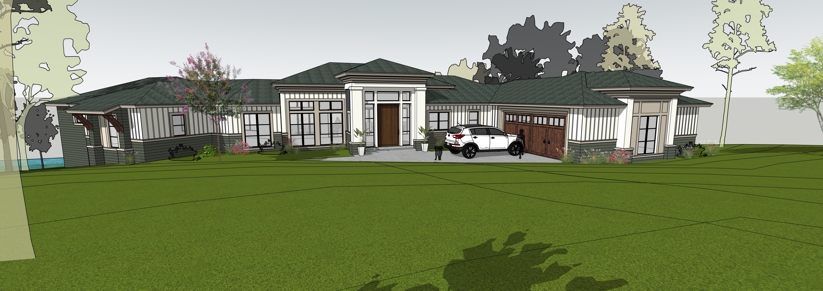sunny day mediterranean home in texas on the lake show real trees and landscaping with a couple people outside the front of the home
