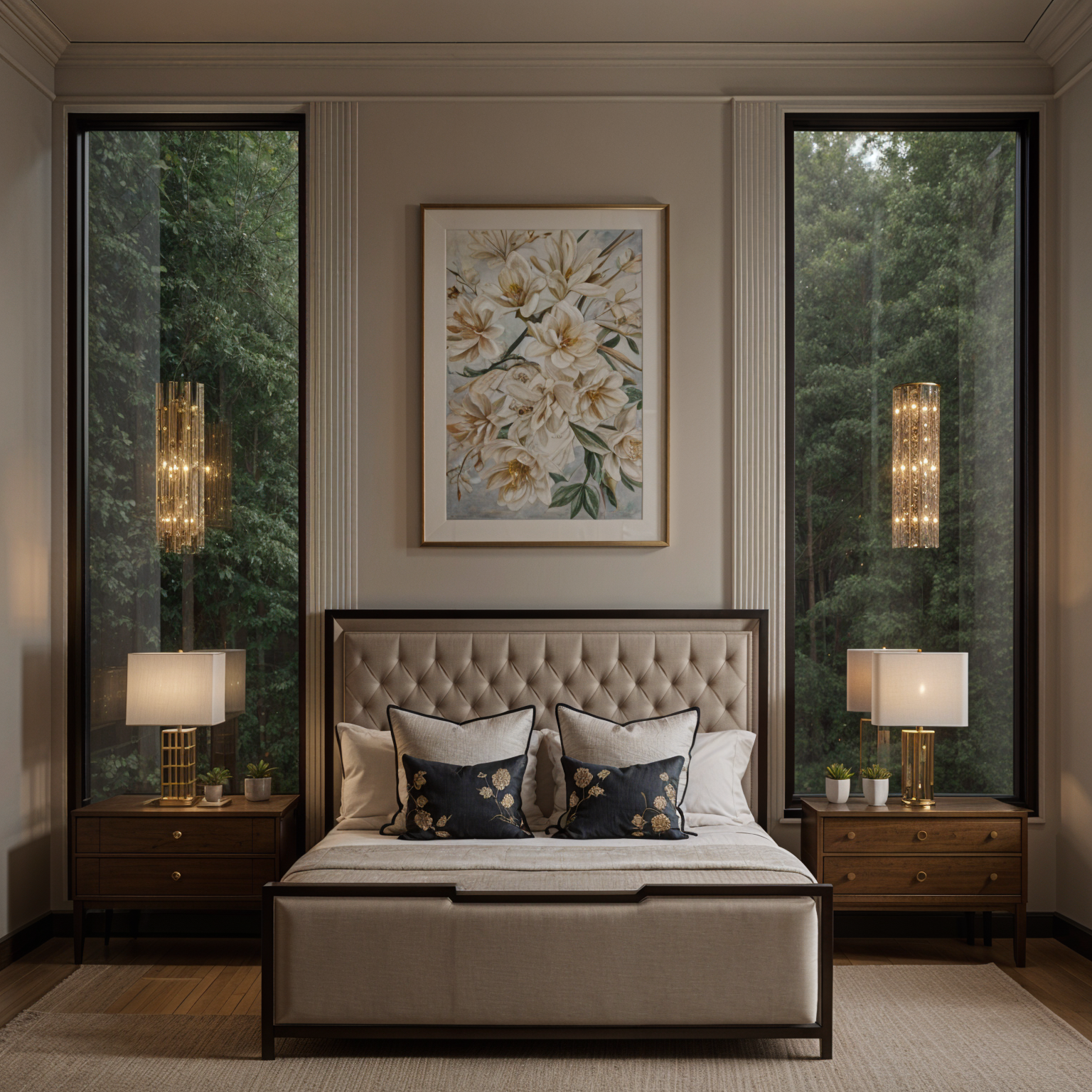 interior shot a modern contemporary bedroom with a serene atmosphere the walls feature a soft textured light taupe color a plush white bed with a sleek light wooden frame sits center stage on either side light wooden bedside tables complement the frame s tone above the bed a unique beige fibre wall hanging adds a touch of bohemian flair sleek modern transparent pendant lights in matte black hang symmetrically casting a warm glow the floor is adorned with a muted taupe rug enhancing the cozy ambiance soft elegant gray curtains frame the scene adding depth and softness to the overall aesthetic the wall at the back of the bed and the left side has no windows the widows are at he left side of the bed facing to a terrace with curved balcony and crystal don t change the direction of the bed architecture