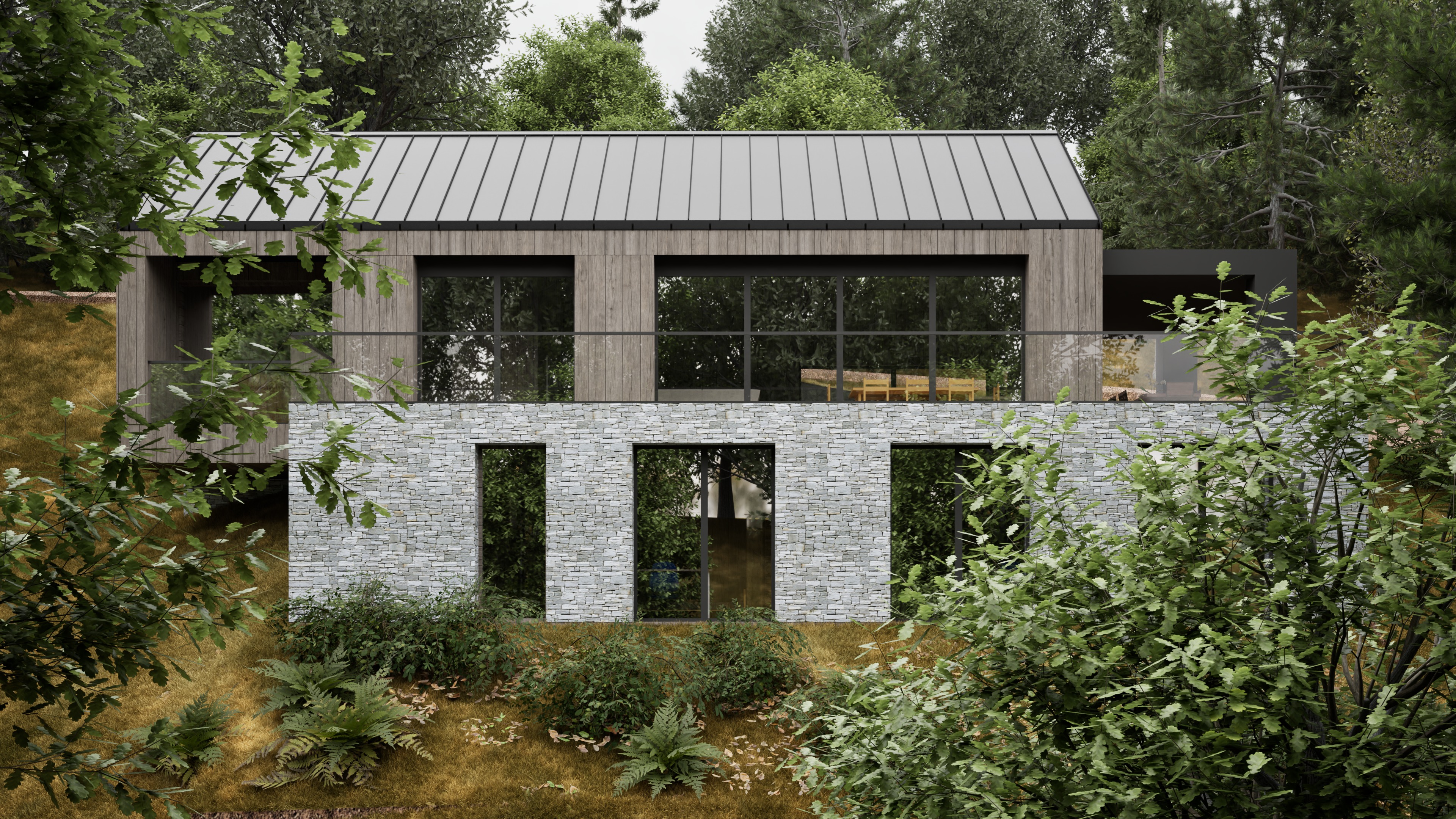 render a modern hillside house with a rustic natural design the exterior features a two story stone facade in soft gray tones with expansive glass windows reflecting the surrounding forest the upper level showcases wooden paneling in deep walnut brown complemented by a sleek black metal frame lush greenery surrounds the house with tall pine trees and vibrant ferns in varying shades of green the landscape has a gentle slope covered in golden brown grass the overall atmosphere is serene and peaceful evoking a sense of being nestled in nature makte ultrarealistic render with little bit more dull lights and a little fog make the wood color grey brown little bit older planks the windows should be less see trhrough and the stone should be litttle darker