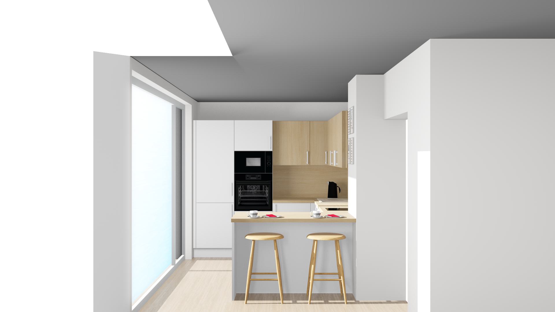 keep the colors of the cabinets keep the dimensions white ceiling add a landscape behind the windows
