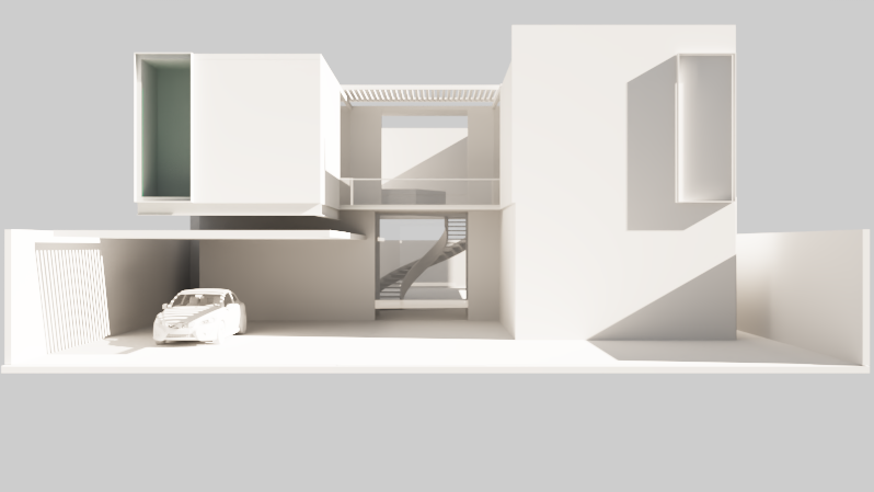 contemporary exterior shot create an architectural render of a modern house with clean minimalist design use soft white and light gray for the walls and structure giving a sense of openness the left section features a garage with a sleek white car the central space includes a graceful modern spiral staircase with metallic silver railings for elegance add a touch of nature with subtle green accents in the form of potted plants near the entrance use warm golden sunlight to cast gentle shadows creating a welcoming and tranquil atmosphere architecture