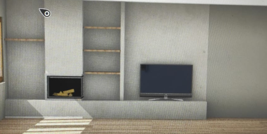 an electric fireplace and beige colors and add led light onder the wooden treys