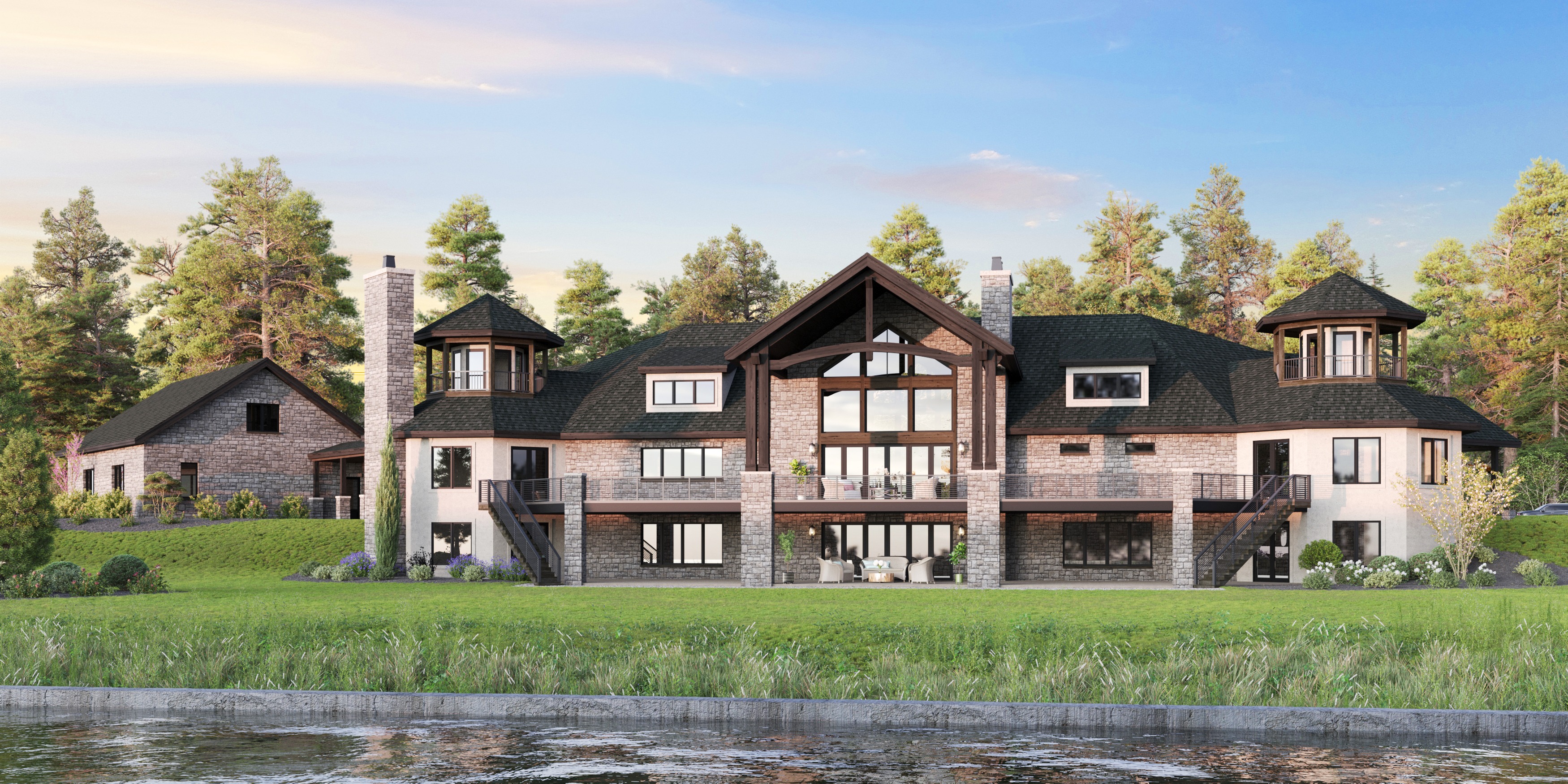 enhance the details of the current rendering do not change any materials or shape of home create more lush vegetation and a more landscaped back yard with a swimming pool and retaining walls