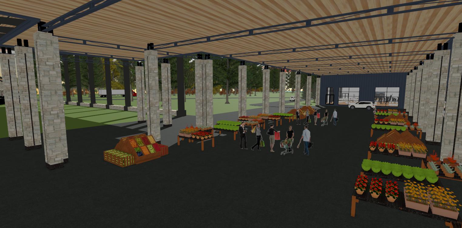 corrugated metal roof on bar joists on concrete piers this structure is about 30 feet tall it is an open air farmers market