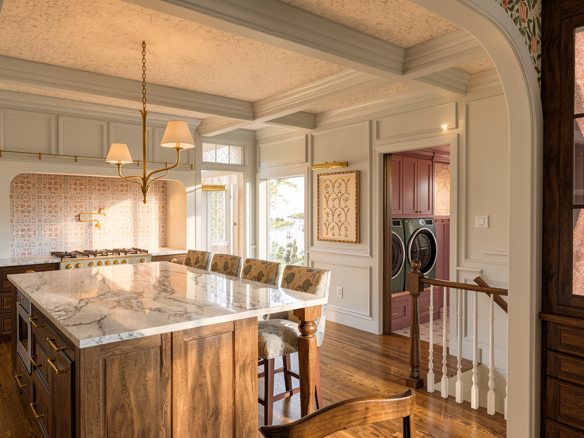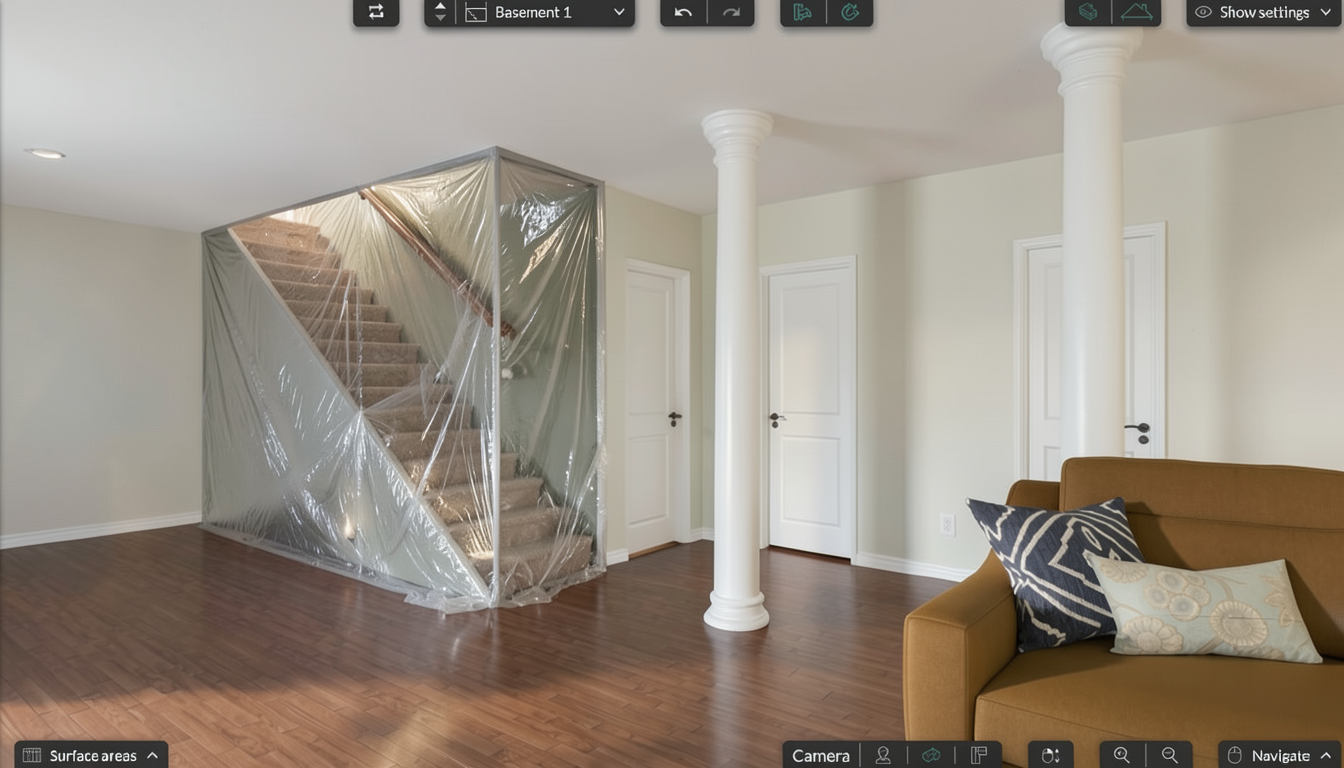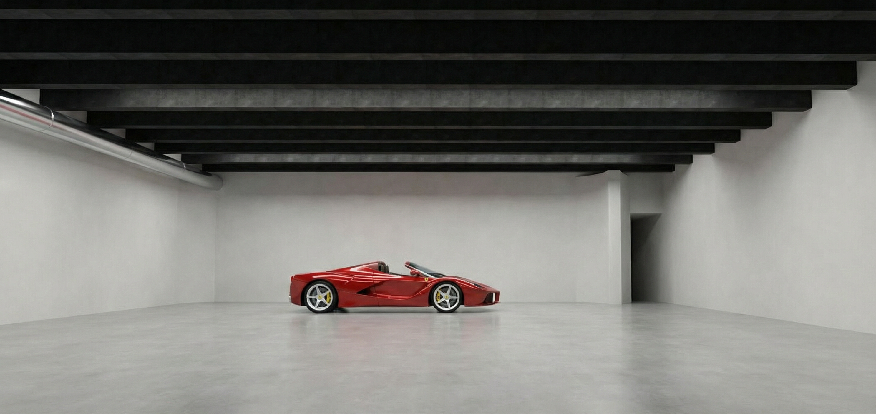modern industrial loft interior double height living space with exposed brick accent wall floating black steel staircase with cable railing leading to mezzanine minimalist open plan layout warm natural lighting through wooden venetian blinds mid century modern furniture including low profile textured sofa sculptural lounge chairs and marble coffee table fitness corner with vintage style workout equipment on dark platform automotive inspired decor red ferrari wall art retro shell gas pump and partial classic sports car in foreground neutral palette with warm wood tones black metal accents and soft textiles matte bleached oak wood flooring clean architectural lines ultra realistic high detail cinematic lighting 4k render