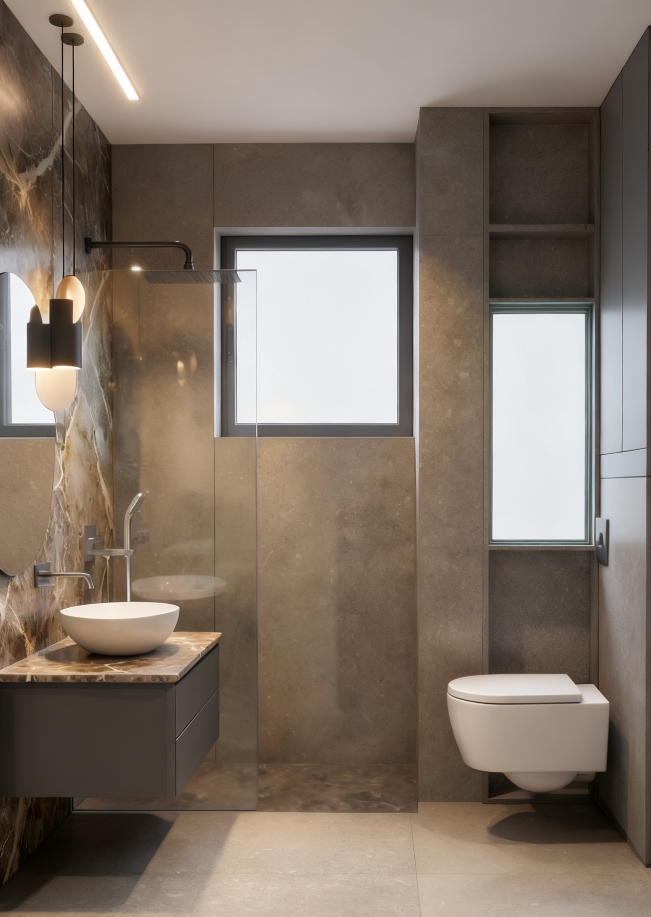 put a grey closed cabinet on the right side of the picture to cover the right window and add led light stripe hidden on the ceiling on the left of the picture and change the pendant light design with a modern one