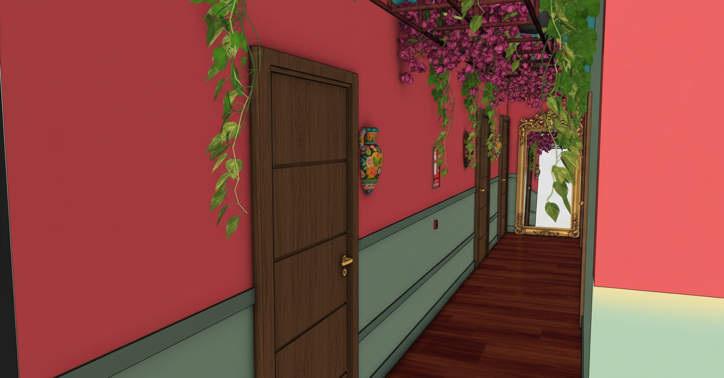make this photo more realistic don t change any geometry update the herringbone pattern on the cabinetry to fluted door fronts in a medium grain use a grey steel faucet update the range to stainless steal add a 6 feet x3 feet island with fluted wood and waterfall countertop plus 3 skylights above it update the countertop and backsplash halfway up the wall to a white and gray ceasarstone use a grey color from benjamin moore for the rest of the walls the island does not extend past the bottom cabinetry add in a fridge to the west wall at the end of the counter run on the south side make the 3 square skylights above the island 1 foot on each side add 3 minimalist knoll style counter stools in tan leather and charcoal black metal legs that have a round back edge add in a roman shade over the window in an black and white mainly black small medium geometric pattern add a hapa teenage boy with black hair and brown skin doing his homework at the island wearing sweats and a blue teeshirt with his back to us add a large black low porcelain fruit bowl onto the island have the cabinets run to the end of each wall make the back door a raise panel door in swiss coffee from benjamin moore add a white cast iron pot to the stove add some blue and white asian style dish towels near the sink add a japandi vibe to the scene add a black and white doormat in front of the back door that has an abstract botanical japanese pattern on it make the hood a white color paint the ceiling the same color as the walls add a cute small japanese dog on a nice flat woven grey white runner rugs in between the island and the sink add the light oak wooden built in desk so it faces the back door