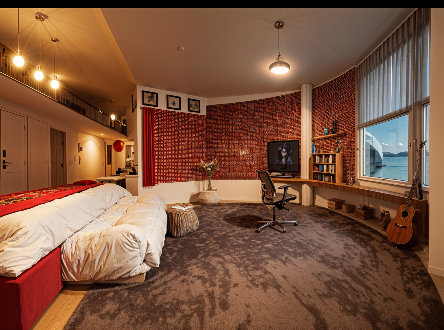 make it more photo realistic add some green plants ont the book shelf in the middle as well as some decor the curtians can be the same shade of pink but a bit more translucent make it warmer and brighter please