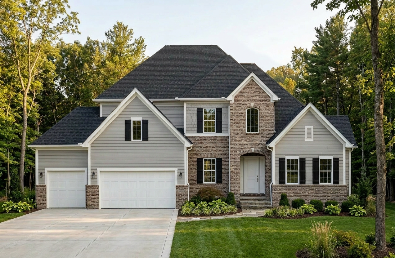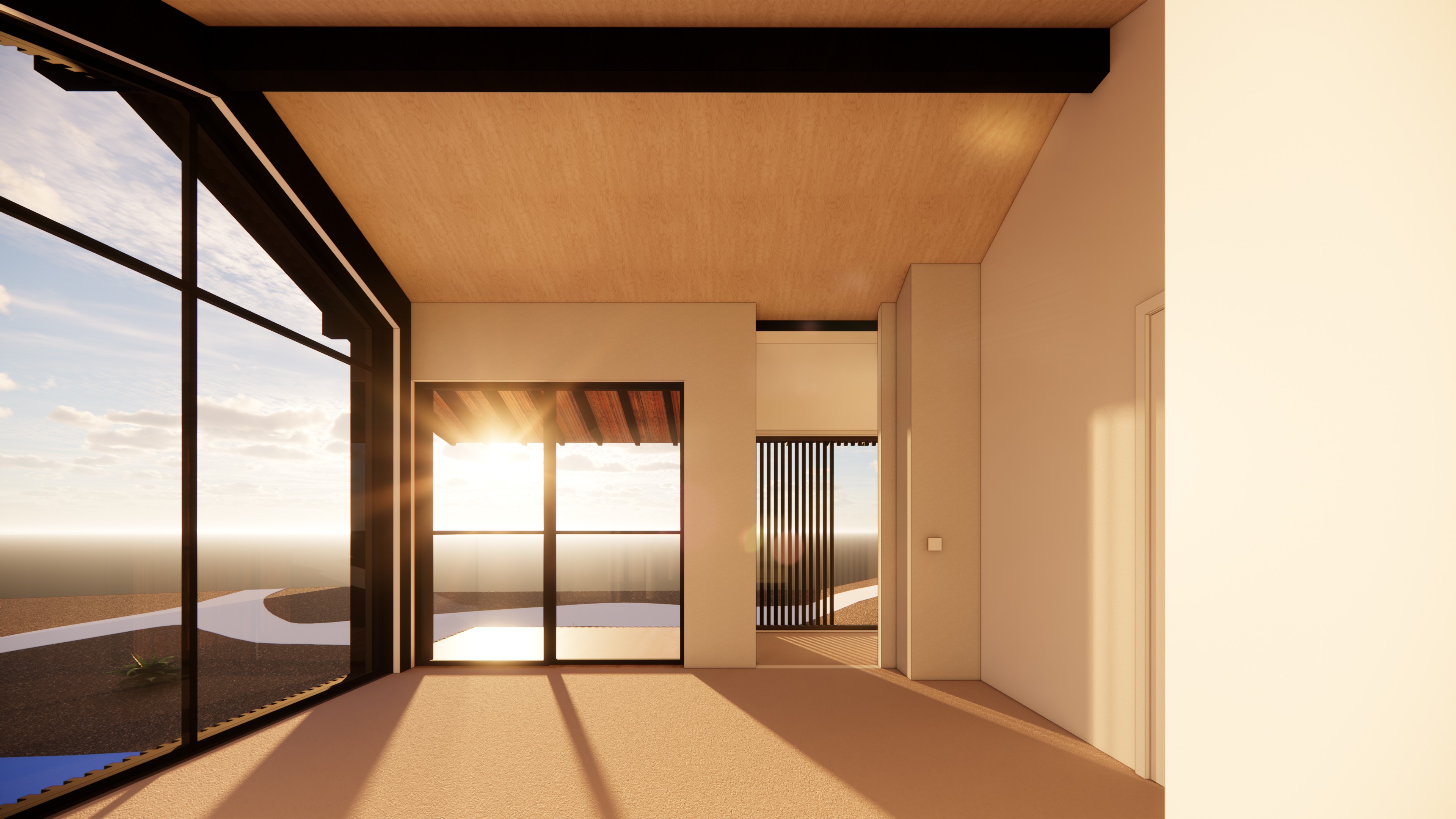 make realistic internal is modern warm colours and woodwn beams opening ar dark black outside you can see a pond and natural vegetations with uneaven landscape the ground is dark brown with lush deciduous plants
