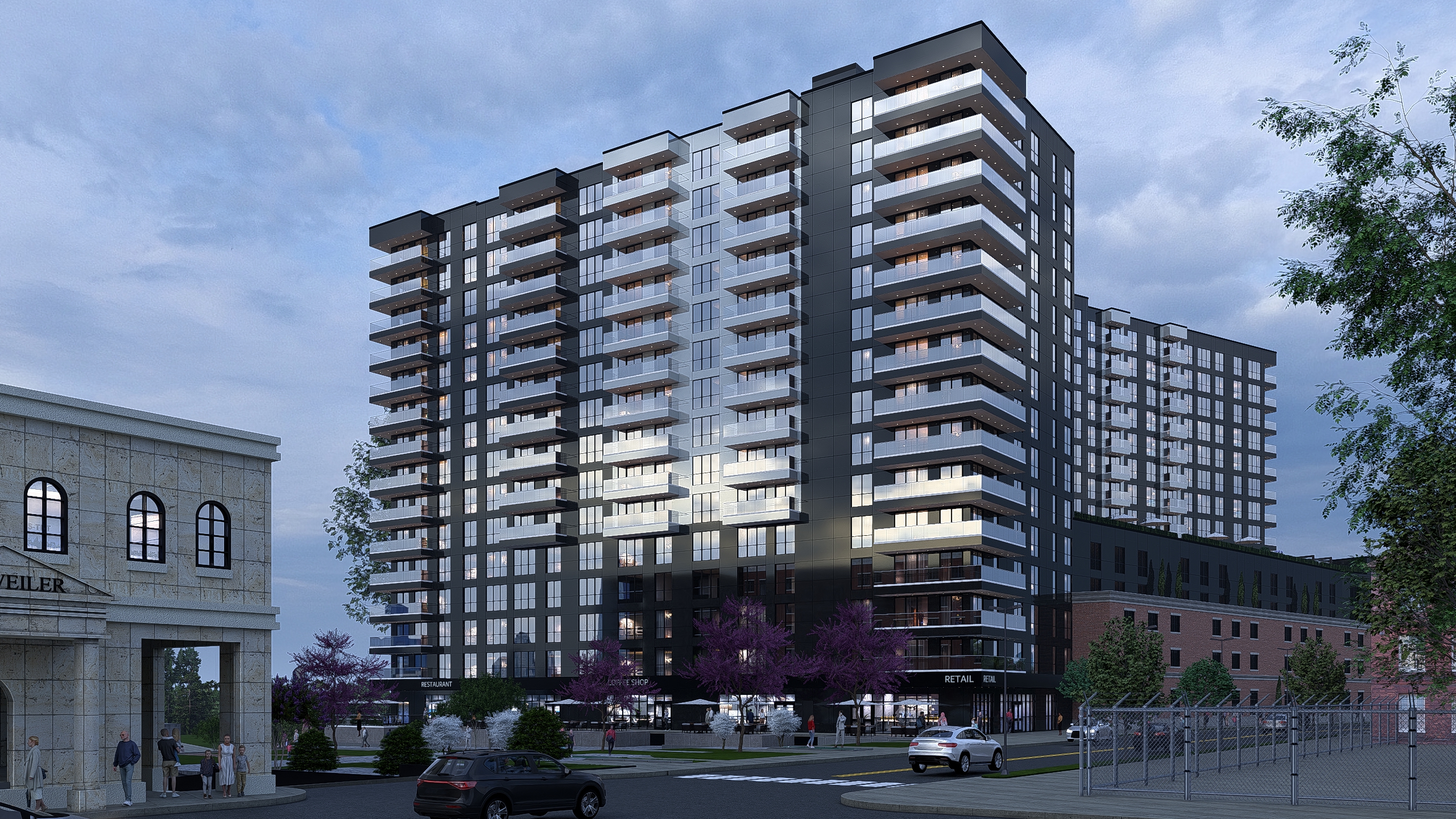 modernist exterior shot improve this architectural render to achieve a highly realistic and photorealistic look enhance material textures lighting shadows reflections and overall image quality improve the realism of trees vegetation landscape elements and surrounding context streets sidewalks neighboring buildings sky and atmosphere use natural lighting with accurate scale and depth do not modify the architecture geometry proportions or design of the building only enhance realism and visual quality the final image should look like a professional real life architectural photograph architecture