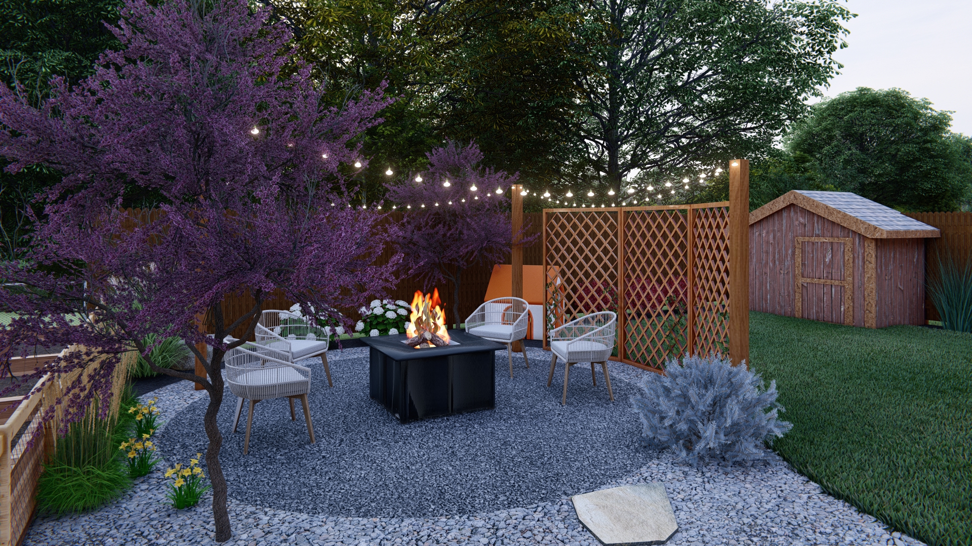photorealistic rendering of a landscape design for a cozy and modern backyard the space is designed for evening entertaining centered around a circular fire pit surrounded by vibrant greenery key elements fire pit a square black metal fire pit or brazier situated in the center of a circular base of dark gray gravel or crushed stone furniture four modern outdoor chairs with white rope weaving and gray cushions arranged in a semicircle around the fire pit landscape two trees with deep purple foliage cercis canadensis frame the scene in the background an immaculate green lawn and low shrubs are visible structures a tall wooden trellis serves as a privacy screen and a rustic wooden garden shed is located in the background to the right lighting and ambiance string lights bistro style or carnival style lights are strung between wooden poles crossing the space above the fire pit to create a warm ambiance accent lighting the fire glows brightly contrasting with the soft light of dusk or twilight flooring a path of light colored stones surrounds the central area of dark gravel creating a clean visual contrast