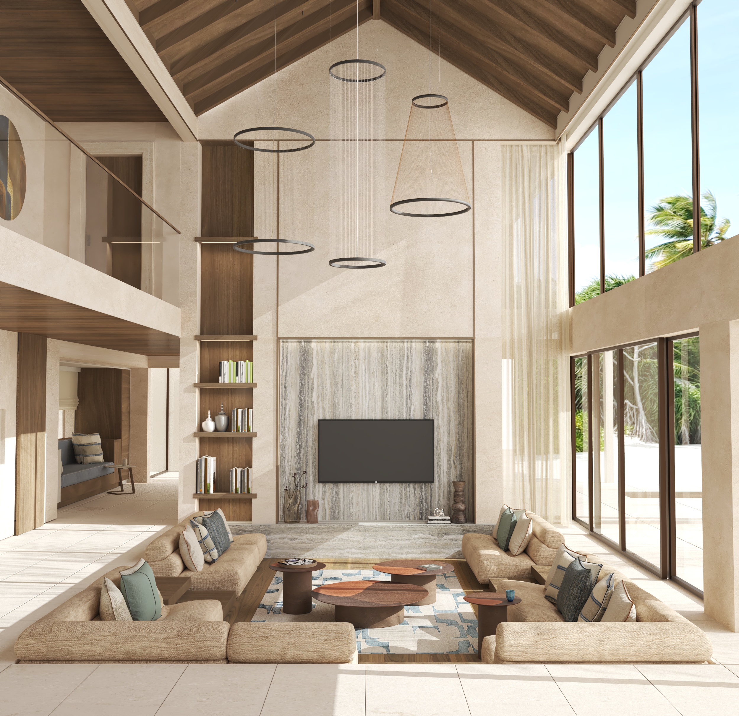 enhance this render into a highly realistic sunny pool side villa scene while keeping all architectural details proportions materials furniture and landscaping exactly the same do not change or add anything use warm mediterranean sunlight soft realistic shadows subtle contrast gentle reflections on glass and polished surfaces richer material textures slight imperfections and natural depth in greenery make the sea bright and calm with realistic sunlight reflections and keep the overall look elegant warm and photorealistic