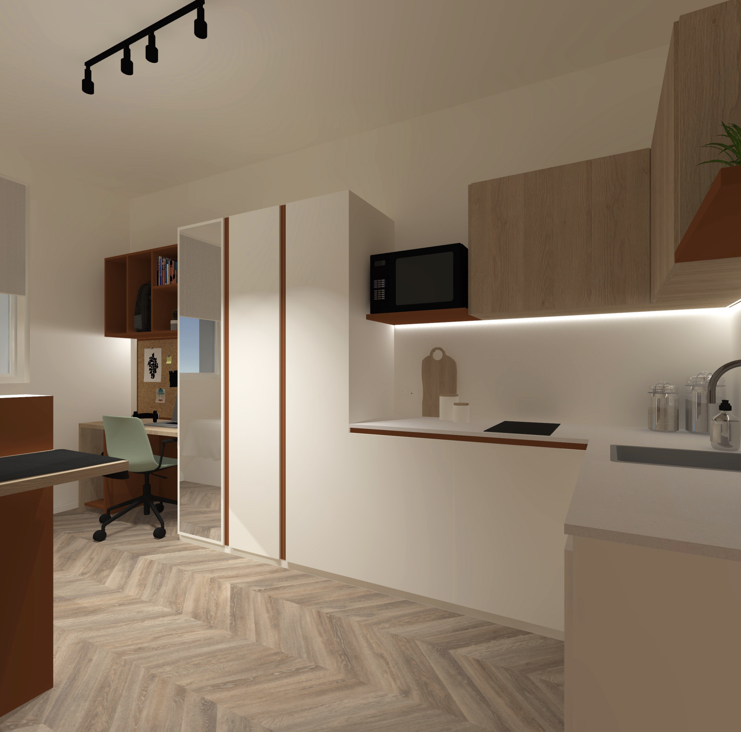 trasforma in render fotografico mantenendo colori e materiali aggiungi oggetti e una persona l anta vicino alla postazione computere a specchio