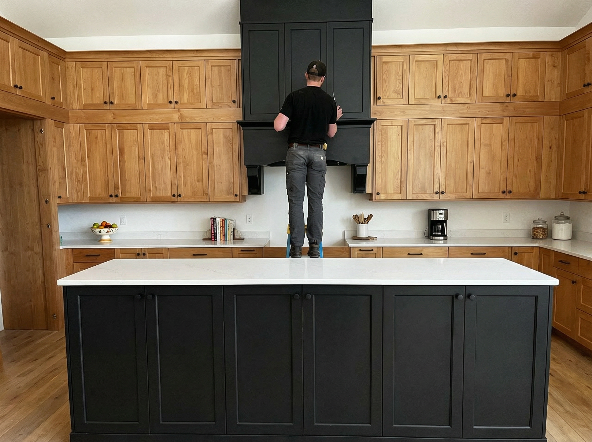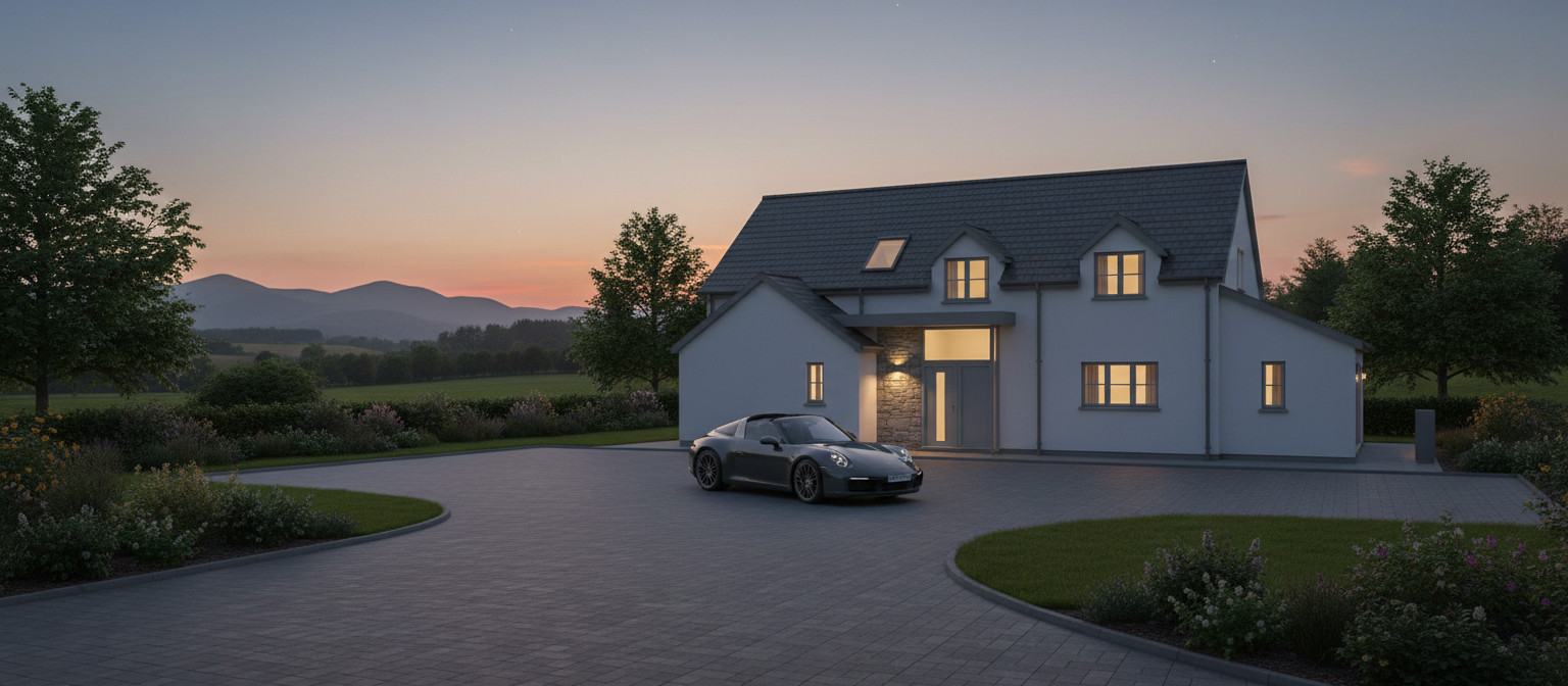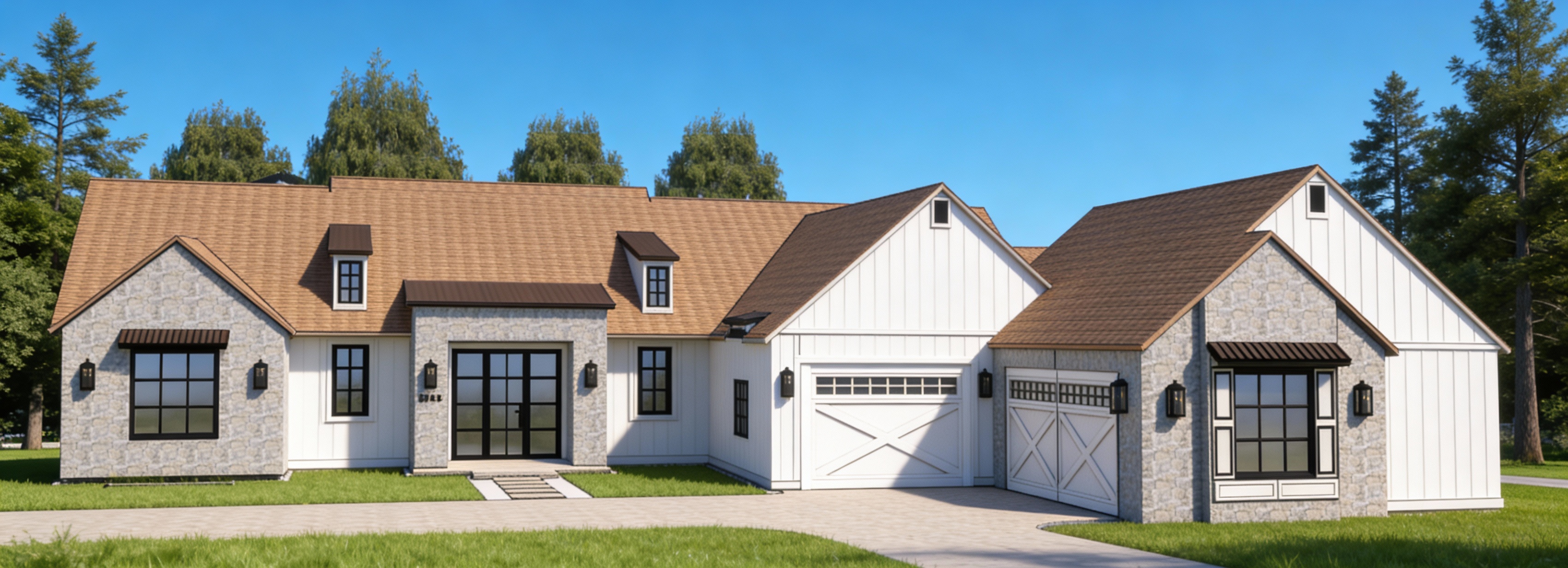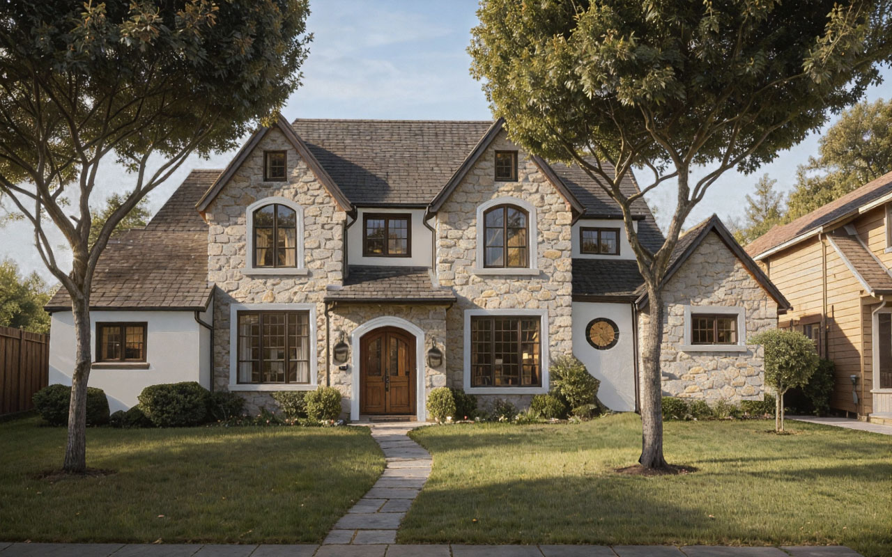 grandbury stone and tan slurry brick home with cast stone surrounds and composition roof show at golden hour