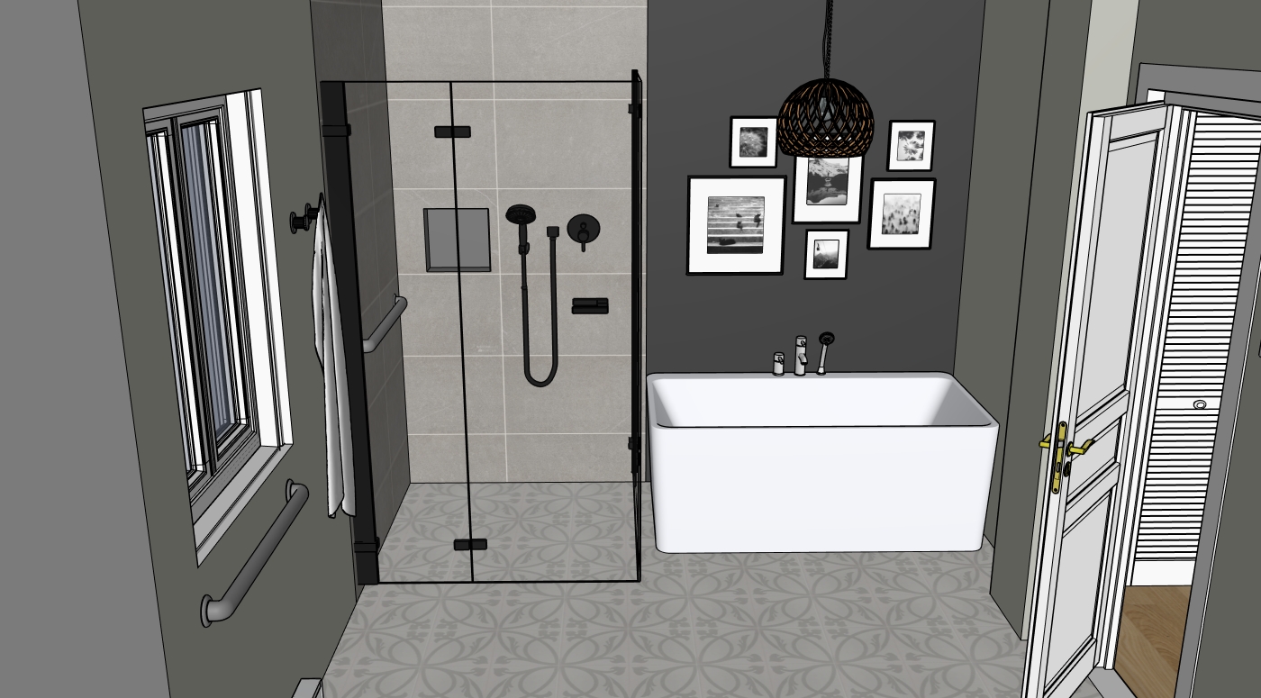 conserver la geometry conserver les couleurs plomberie chrome porte en blanc installer le bain au plancher niche douche gris