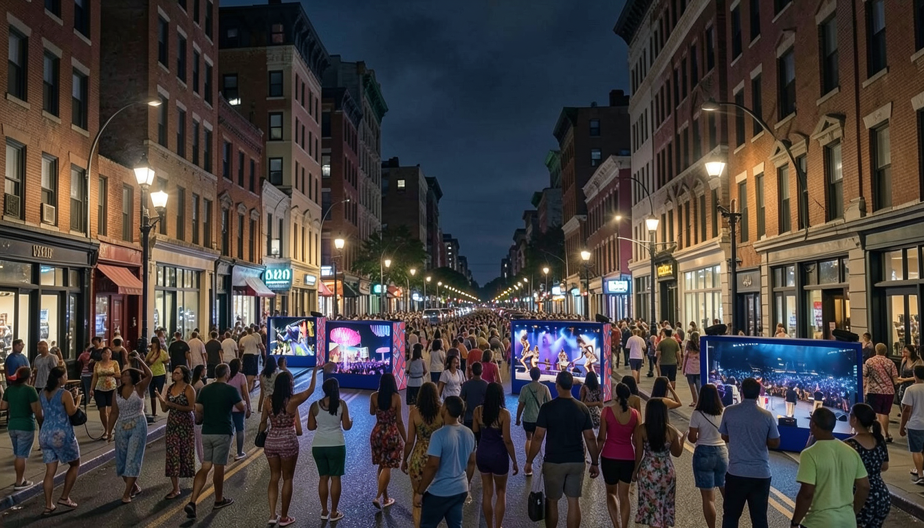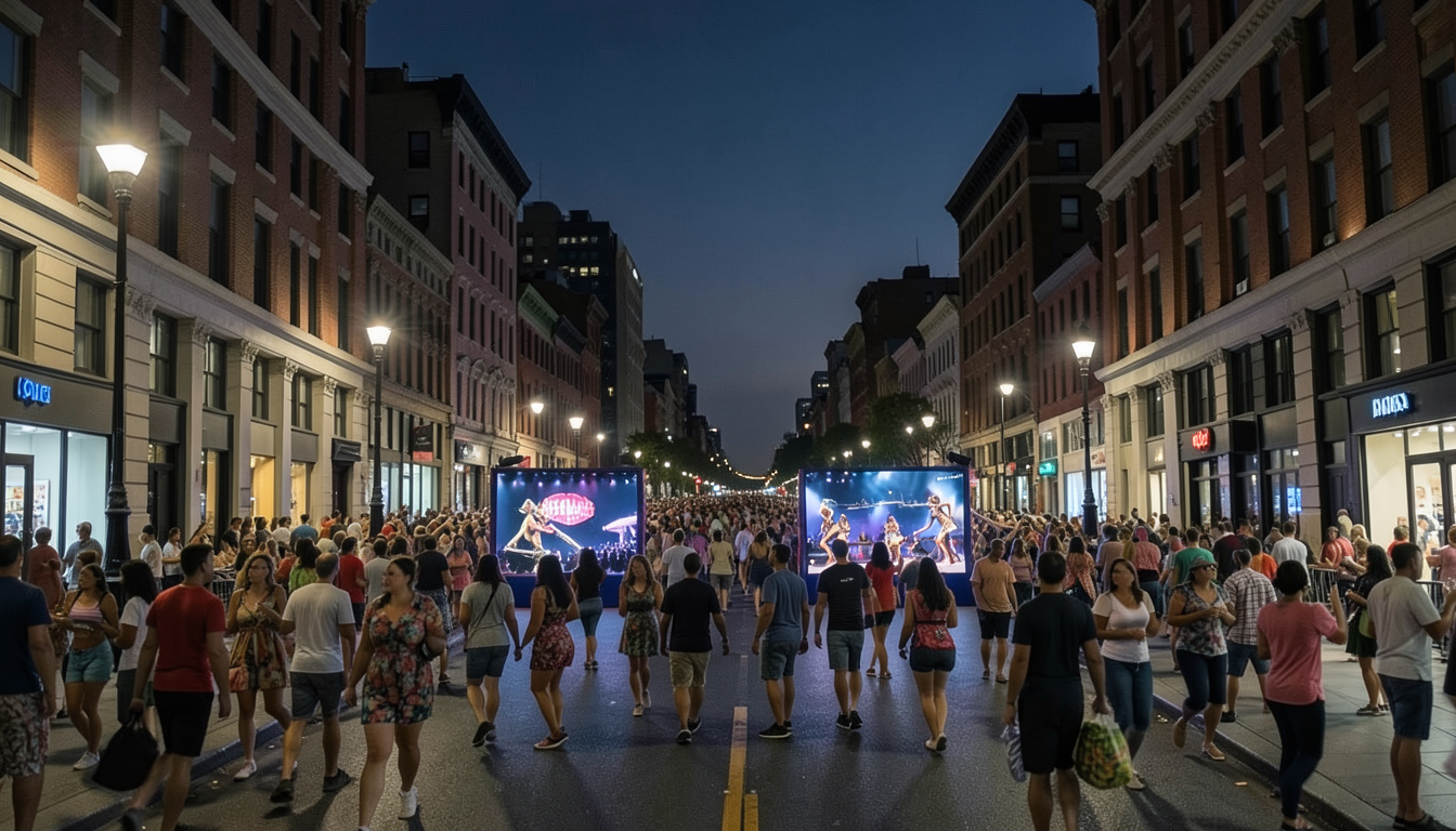use exactly the same base render do not modify move rotate resize reinterpret or redesign any structure or screen the led screen structures must remain strictly identical in scale real world scale not enlarged or miniaturized in the exact same relative position placed in the true center of the street width equidistant from both sidewalks aligned in the direction of the street parallel to the street axis and pedestrian flow never perpendicular never diagonal never across the street critical dimensional clarification only the led display surface measures 6 6 x 11 the supporting structure scale must remain realistic and unchanged street scale override important sainte catherine street must keep realistic downtown montreal proportions two sidewalks one central pedestrian circulation zone the led structures are positioned on the centerline of the street like a longitudinal median the screens must not appear too wide too dominant or blocking circulation modify only the environment to represent sainte catherine street west montreal between saint urbain street and saint laurent boulevard during the nuit d afrique festival environment urban nighttime penumbra street closed to traffic realistic montreal downtown buildings brick and stone fa ades ground level commercial storefronts urban street furniture summer night atmosphere low ambient light penumbra dominant crowd and atmosphere large dense but readable crowd strong multicultural diversity nuit d afrique context balanced gender mix mostly young adults and families festival clothing colorful accents but overall darker tones people walking on both sides of the screens not blocked by them lighting penumbra dominant led screens 6 6 x 11 are the primary light source streetlights are secondary and soft no stage lighting no beams no spotlights camera and realism street level human eye perspective correct urban scale no forced wide angle distortion no cinematic exaggeration absolute position scale override the led screens must be positioned on the longitudinal centerline of the street forming a central median with clear pedestrian circulation on both sides any placement that visually pushes the screens toward one sidewalk enlarges them unrealistically or makes them act as barriers is incorrect final objective create a credible correctly scaled nighttime urban integration of unchanged led screen structures installed in the true center of sainte catherine street west between st urbain and st laurent aligned with the street direction in a multicultural festive low light nuit d afrique context