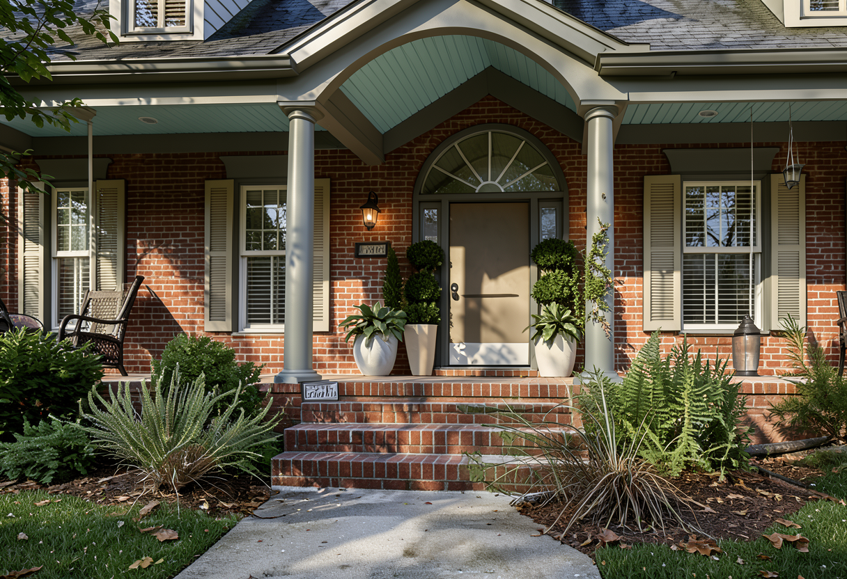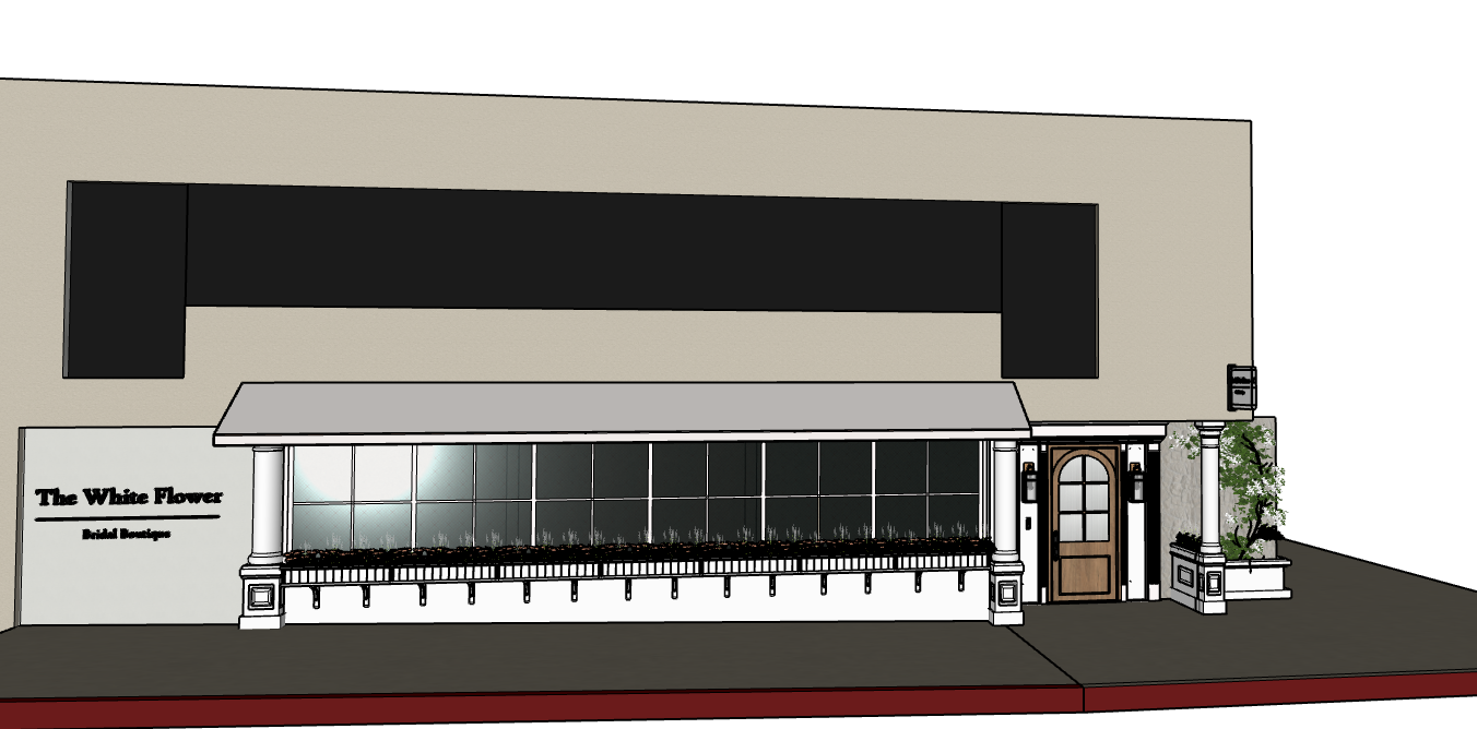 exterior of building in an urban environment windows are tintend very dark exterior pillars are all white awning over bottom windows is cream beige fabric with a mauve flange piping on the edges make planter boxes under bottom windows all white including the support brackets make the plantings in planters under windows more organic visually with flowers and greens the wall that pops out on the second story is a darker beige stucco than the white lower recessed portion of the face all paneling around wood door is white