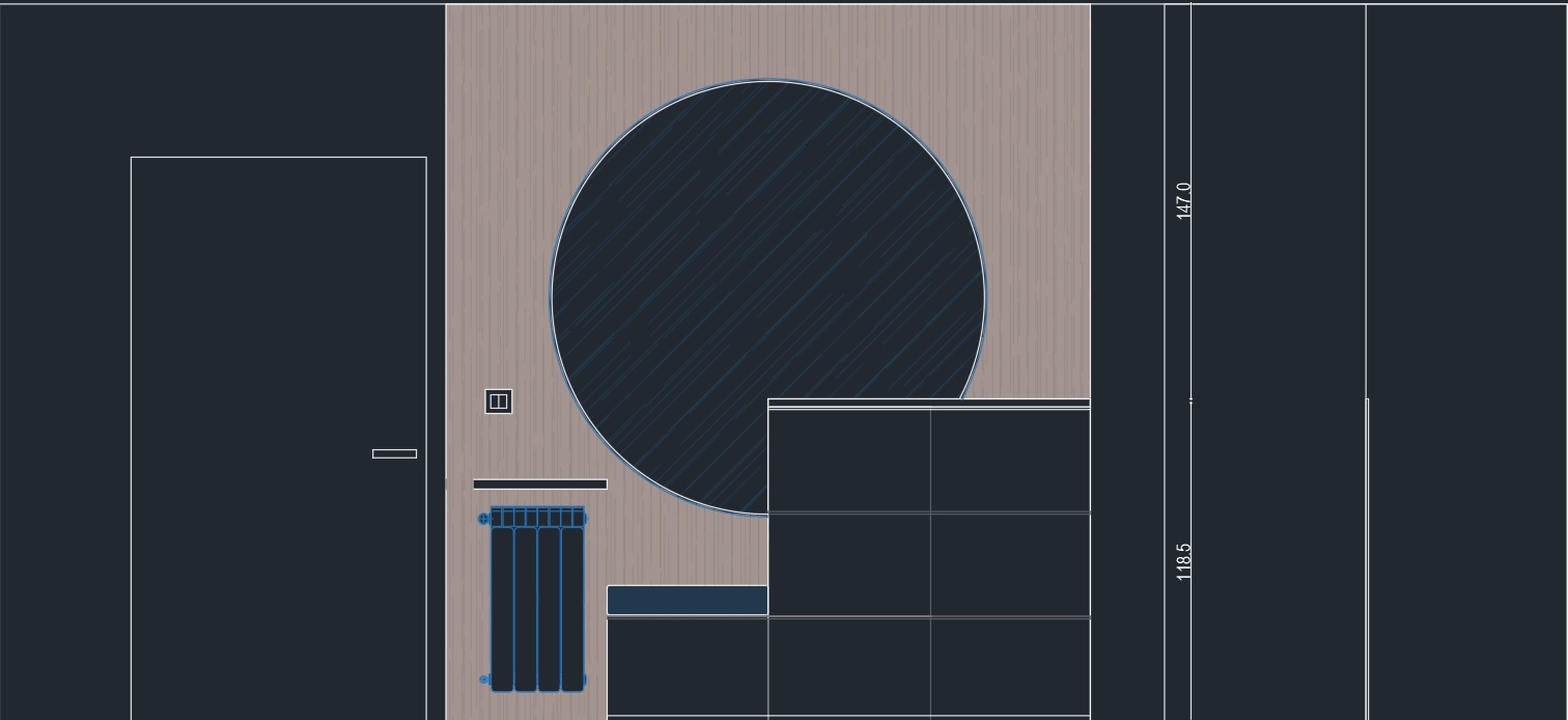 zid duzine 584cm visine 267cm boja zida soft beige ulazna vrata crispy white radijator bele boje polica iznad radijatora zaoblejnih ivice d 36mm i bez boje fiokar sa jastukom za sedenje bez boje fiokar od bez univera jastuk u tamno braon stofu desno od sedista ormaric dvokrilni u bez boji drvni dekor obloga na zidu ogledalo kruznog oblika zalazi iza komode prekidac za svetlo bele boje iz aogledala skrivena rasveta desno od drvene obloge zid u bez boji i dvokrilni ormar bez boje koji upada u nisu tako da su mu krila u ravni sa drvenim panelom i sa zidom
