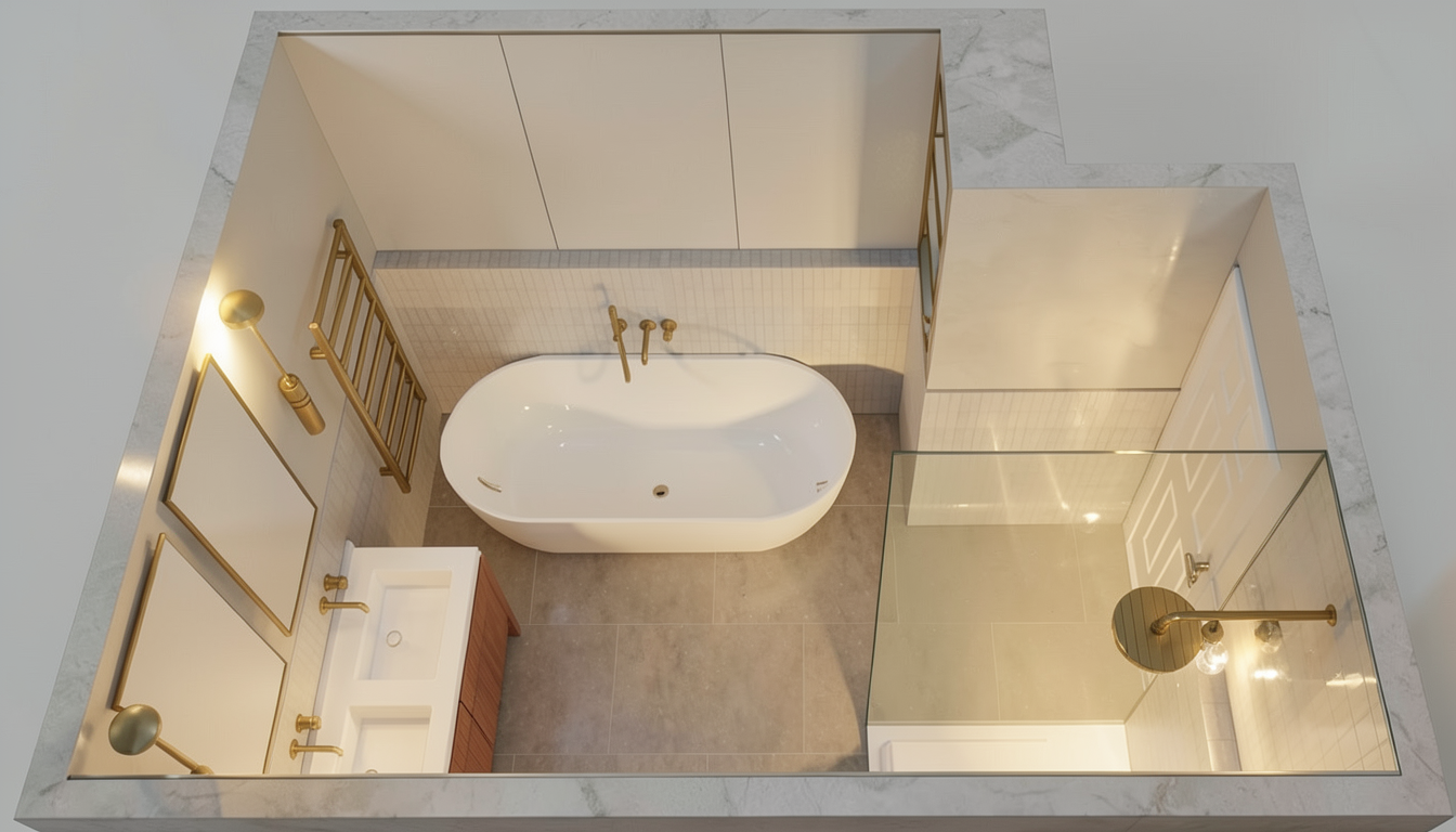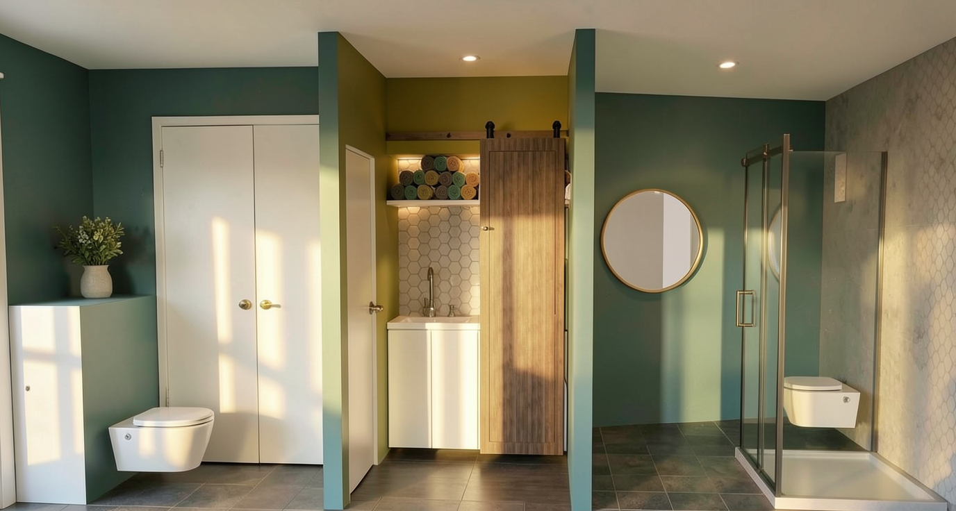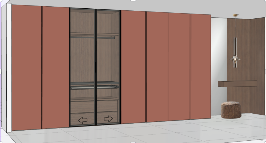 light oak laminate floor glass doors without signs on bottom mirror with correct reflections next to wooden wall panel and terracotta door few outwear clothes inside glass unit and led lightening