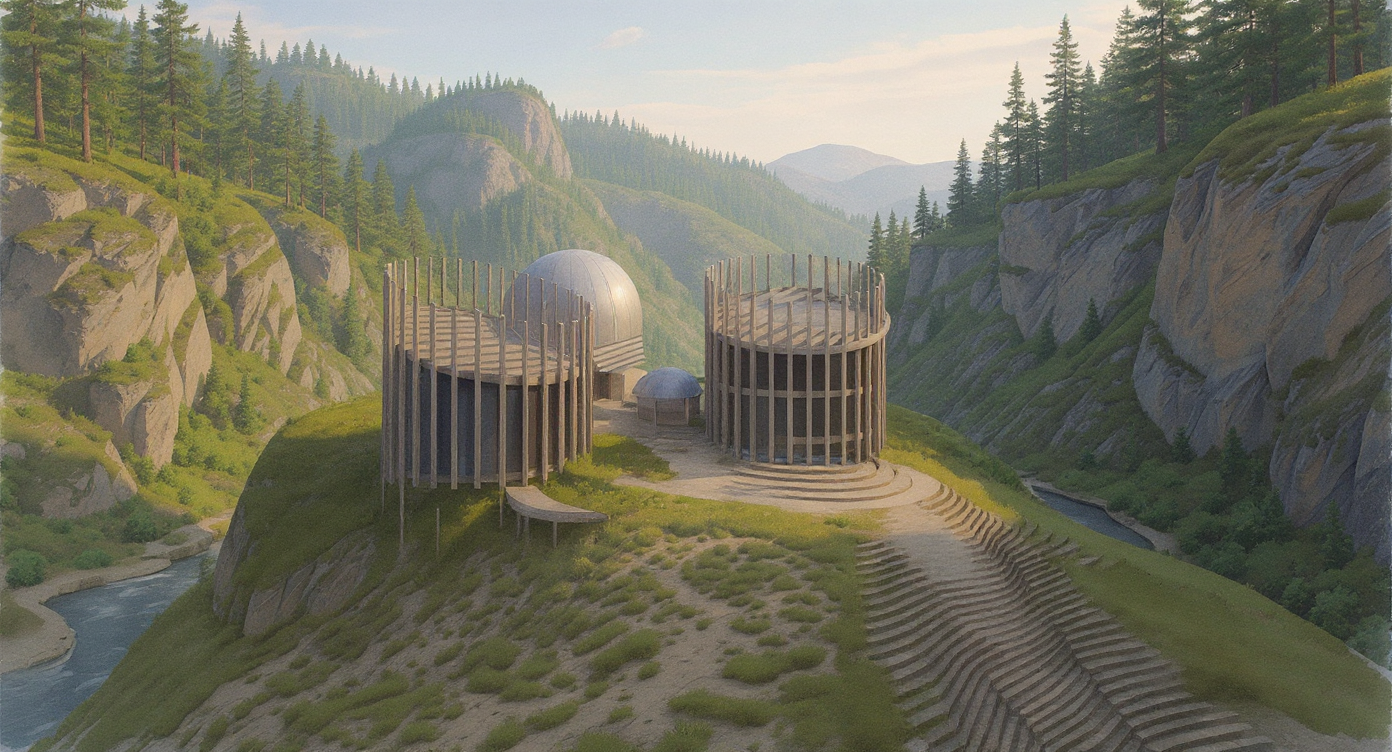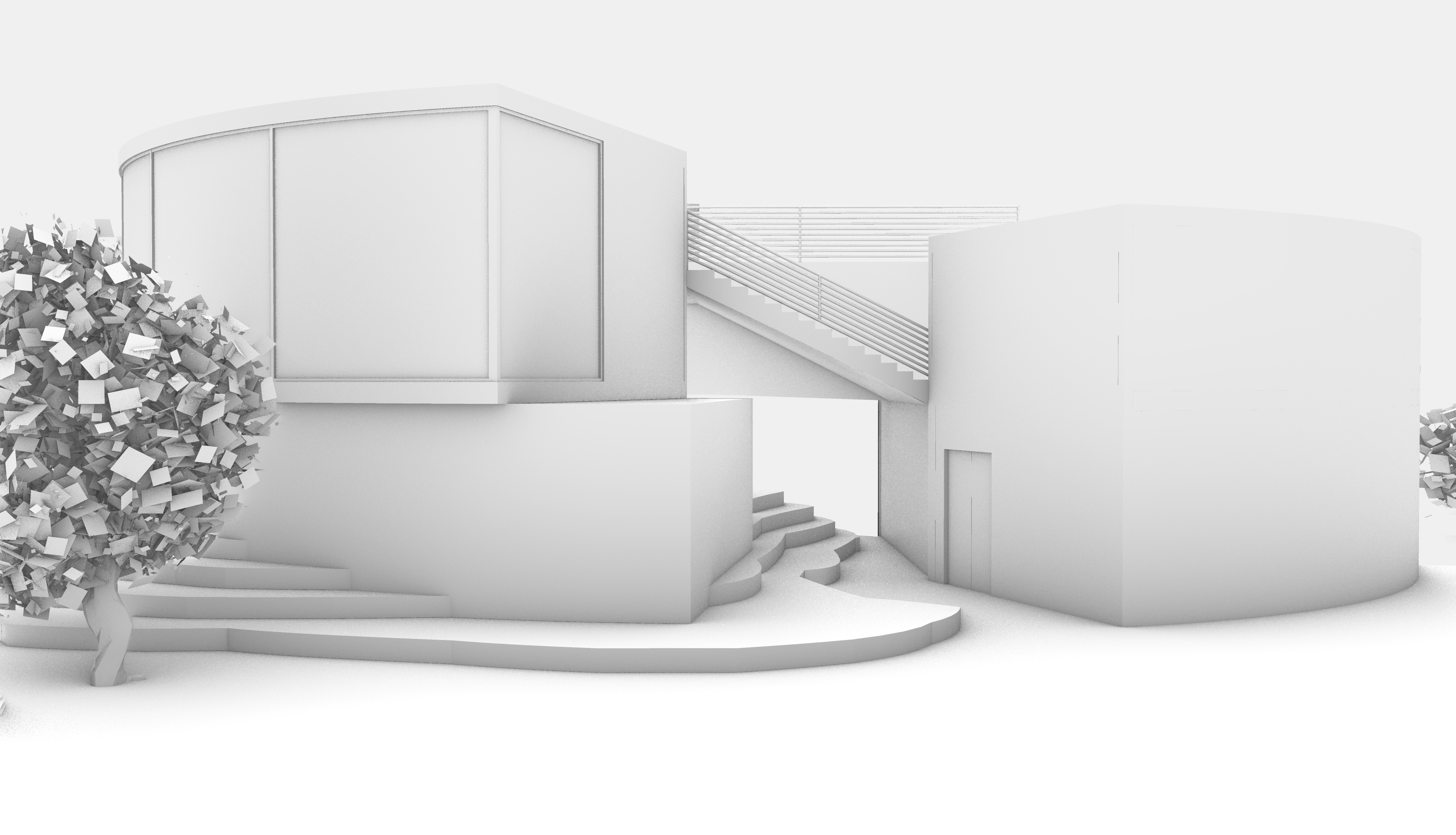 architectural realistic grayscale rendering of a small contemporary research station perched on a rocky terrain structure made of titanium panels black steel and glass precise and realistic architectural detailing cantilevered over stone terrain supported by steel beams surrounded by mountain pines and mist below rendered with crisp building geometry and realistic materials background and edges dissolve into the mist edges not full bleed with soft unfinished fade around the image soft ambient lighting overcast sky moody grayscale rendering high detail model aesthetic conceptual design architecture studio presentation style