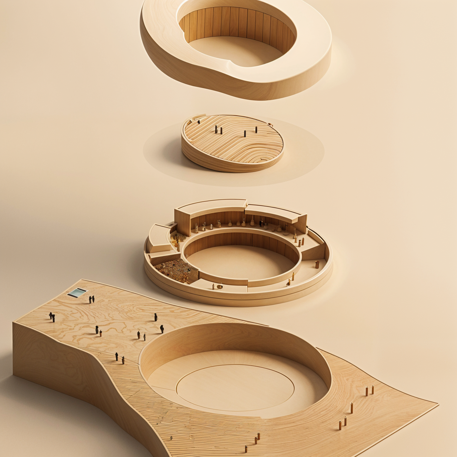 render this as an architectural render pavilion with a concept of a nature woody material the middle area is an open space architecture